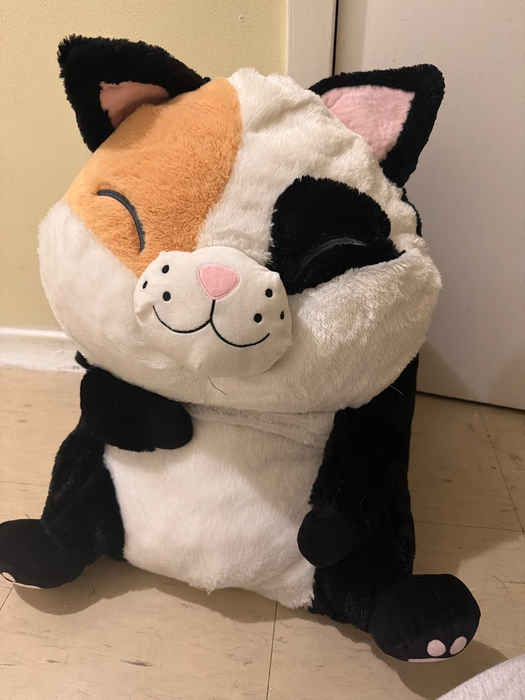 This is a large, fluffy plush toy designed to look like a calico cat. It features soft, fuzzy material in white, black, and orange patches with pink accents on its inner ears and paw pads. The stitching for its eyes and nose gives it a charming expression. It's a great size for cuddling!
