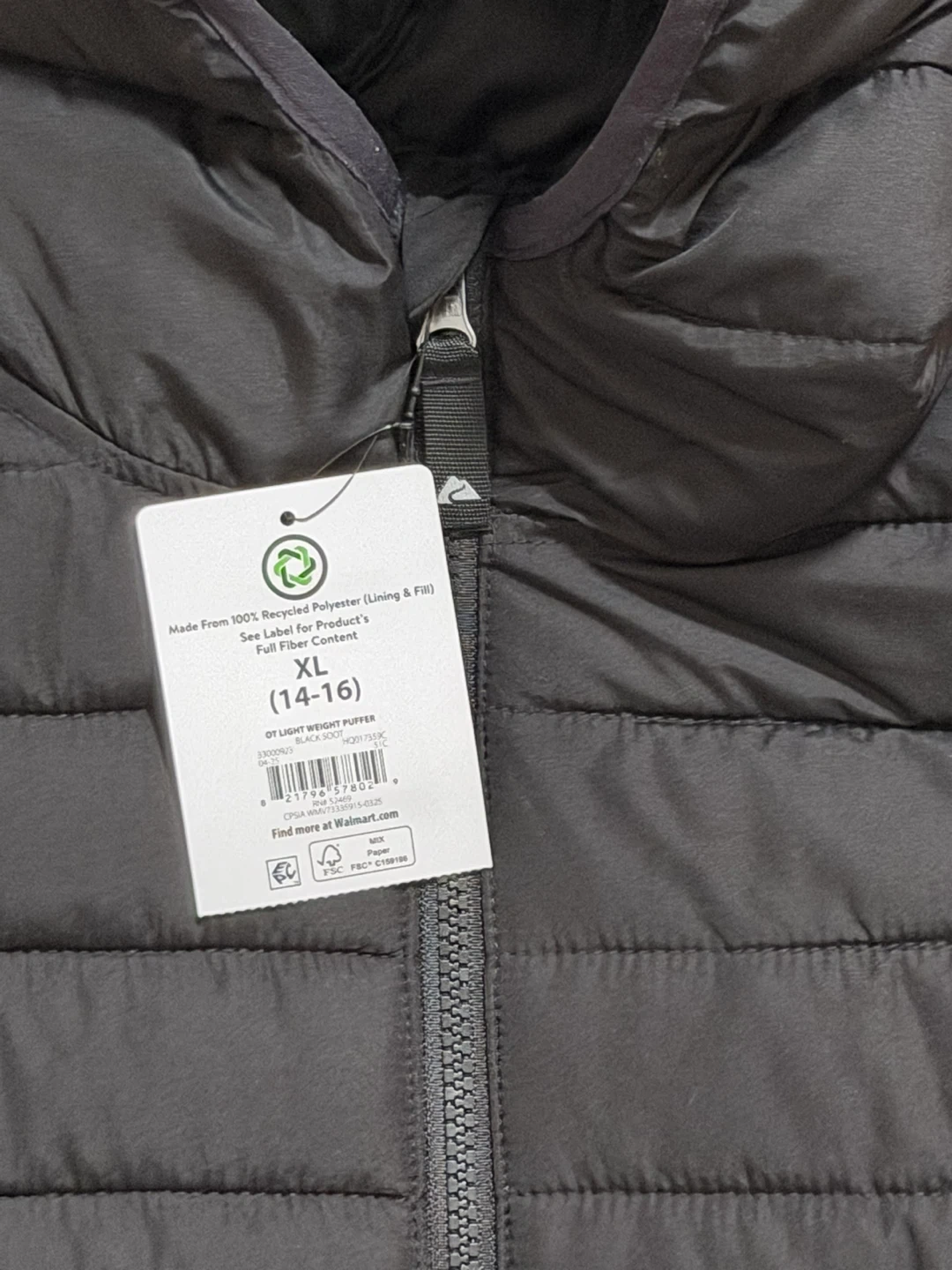 Selling a black Ozark Trail puffer jacket. It's a lightweight puffer jacket and is a size XL (14-16). Made from 100% recycled polyester for the lining and fill!