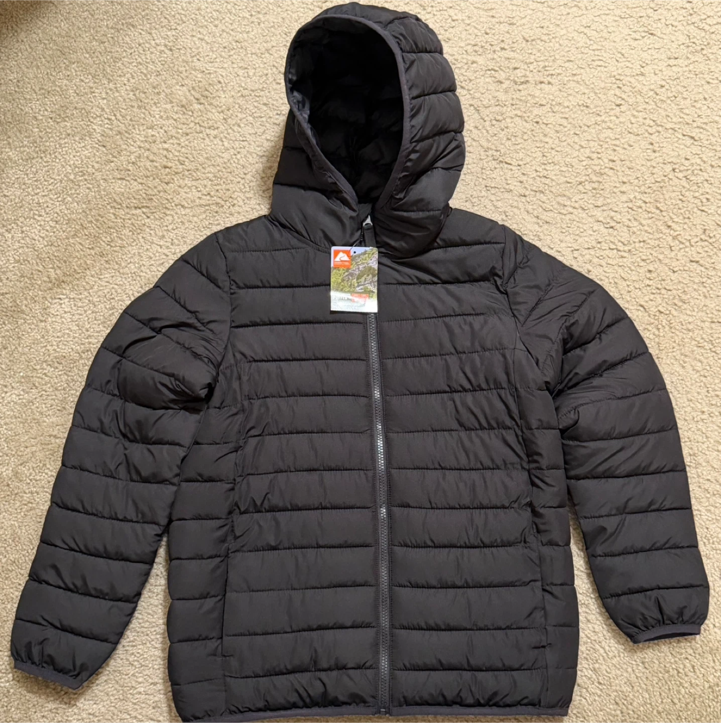 Selling a black Ozark Trail puffer jacket. It's a lightweight puffer jacket and is a size XL (14-16). Made from 100% recycled polyester for the lining and fill!
