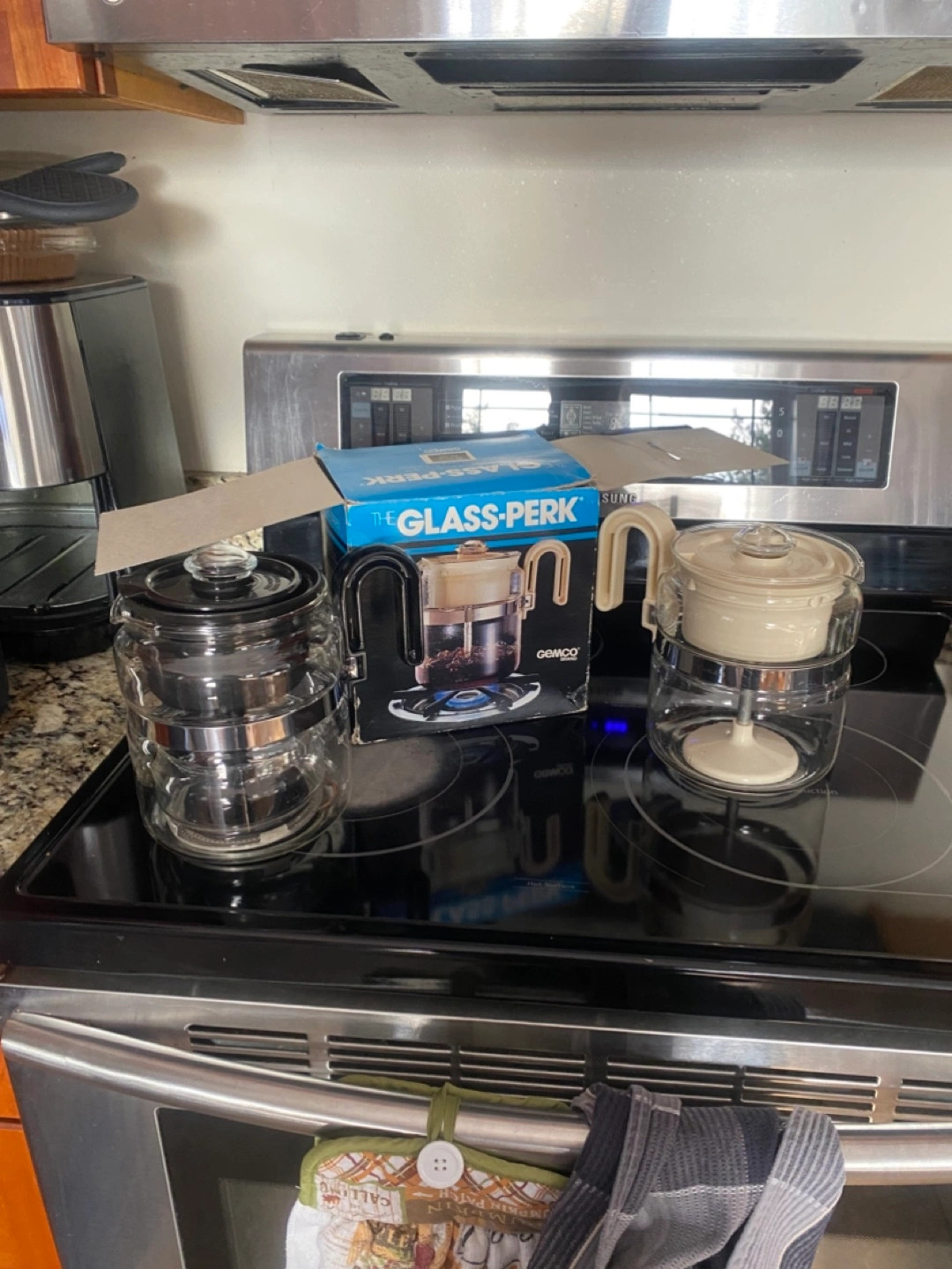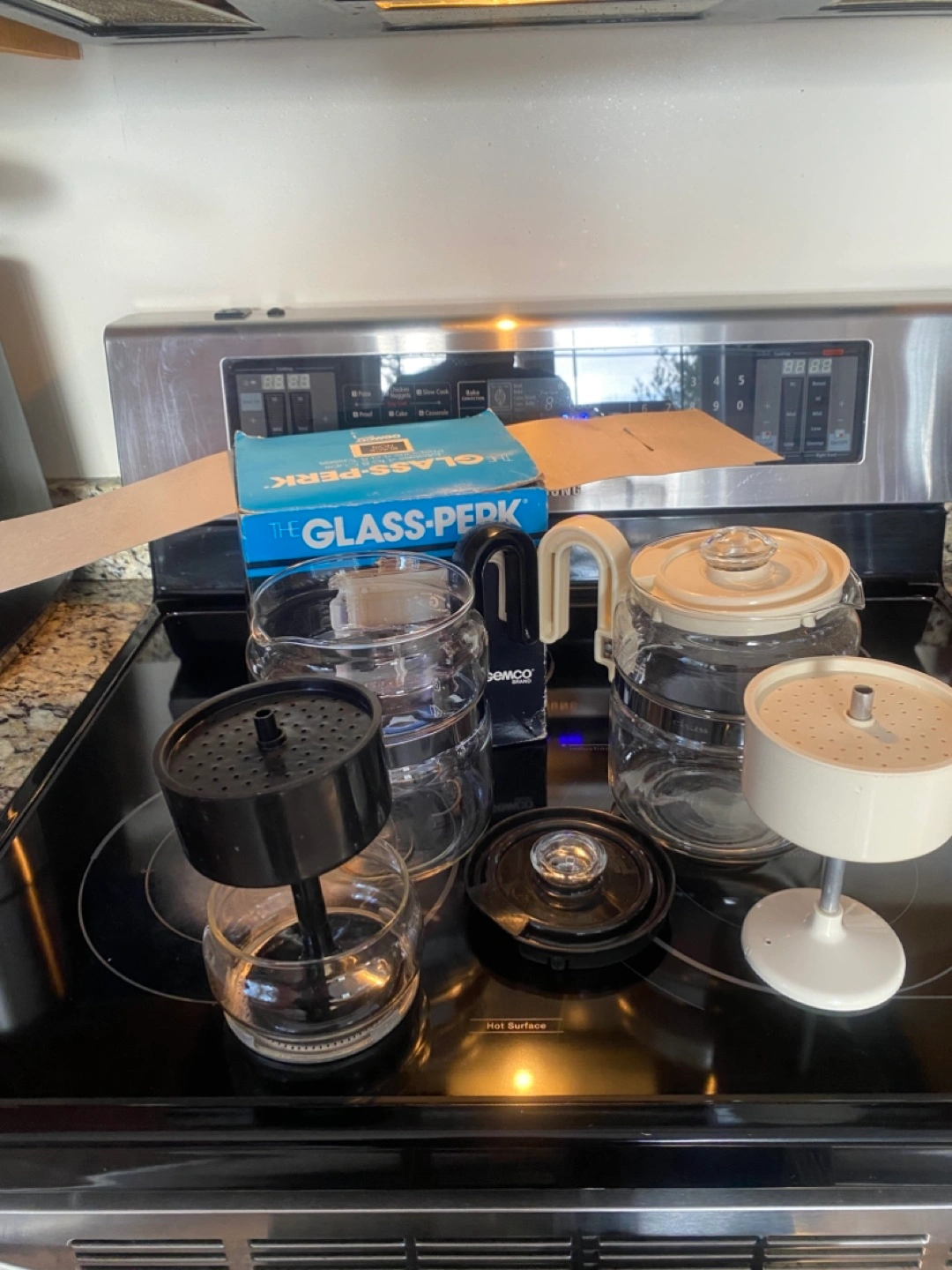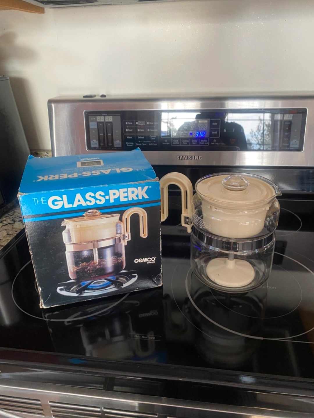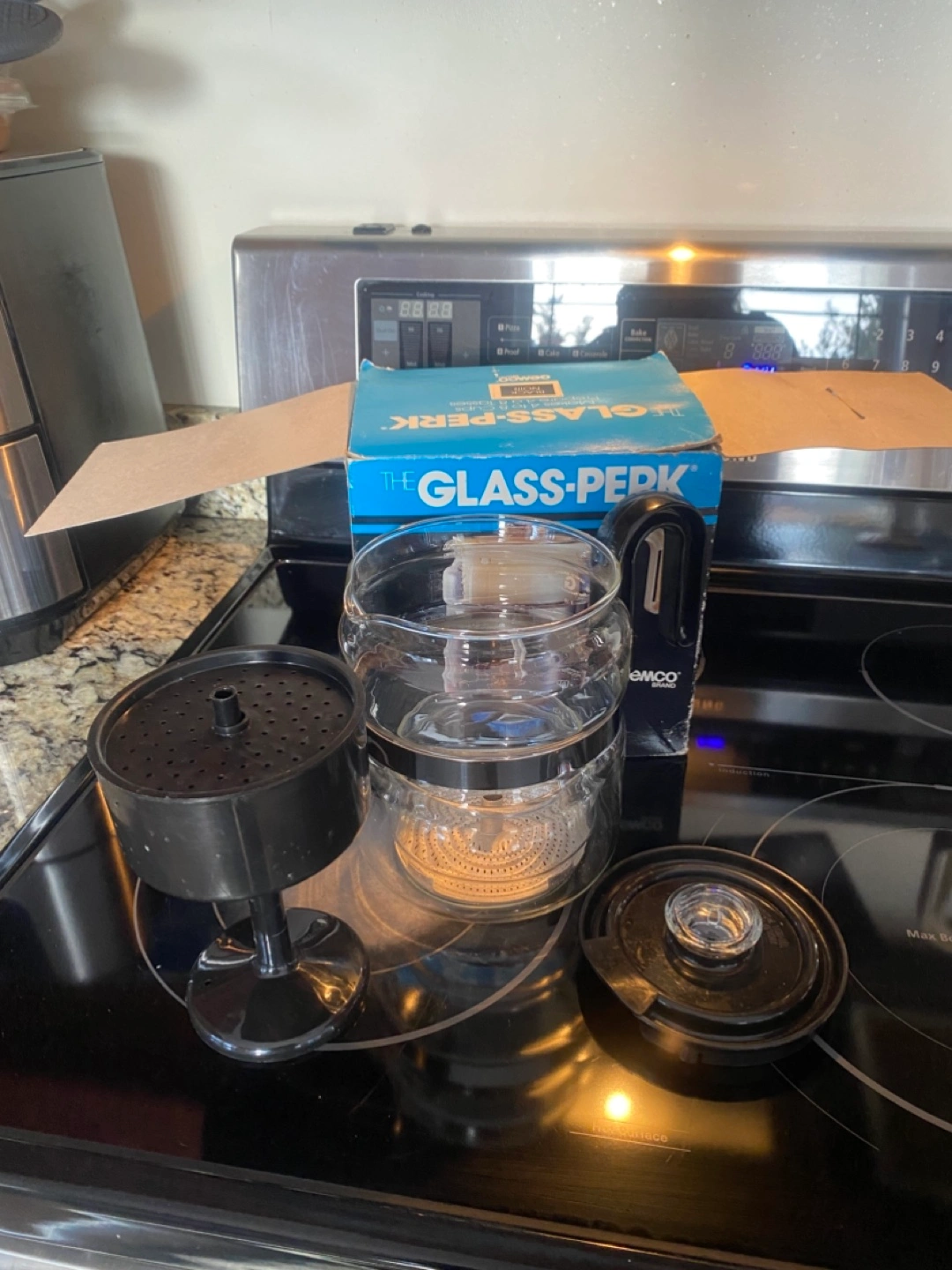 Vintage Gemco Glass-Perk coffee maker. Includes all parts. Complete with original box. Glass carafe and parts. One is new and the other has been used couple times. Price is for each pot . New one is 60.00 used is 50.00 . Pick up Port Elmsley