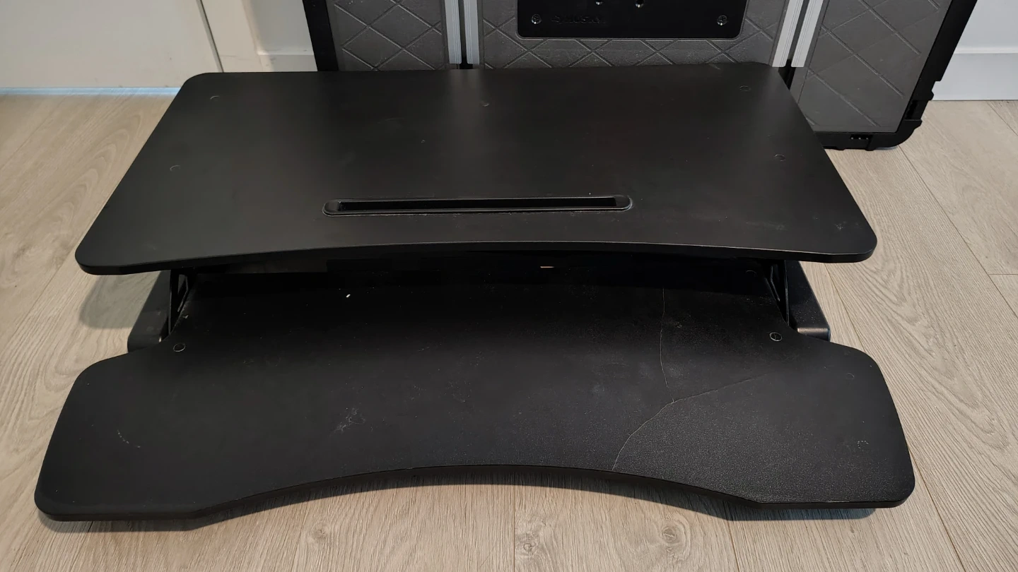 This is a black standing desk converter. It's adjustable to different heights. The top surface is for your monitor and the lower surface is for your keyboard and mouse.