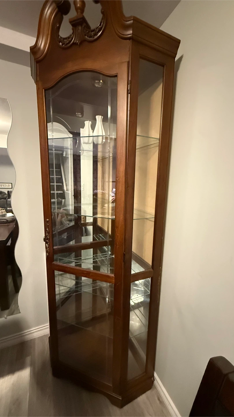 This beautiful curio cabinet is made of dark wood and features glass doors and shelves. It's perfect for displaying collectibles, china, or decorative items. The cabinet has multiple adjustable glass shelves. One side mirror is missing but easy to get replacement.