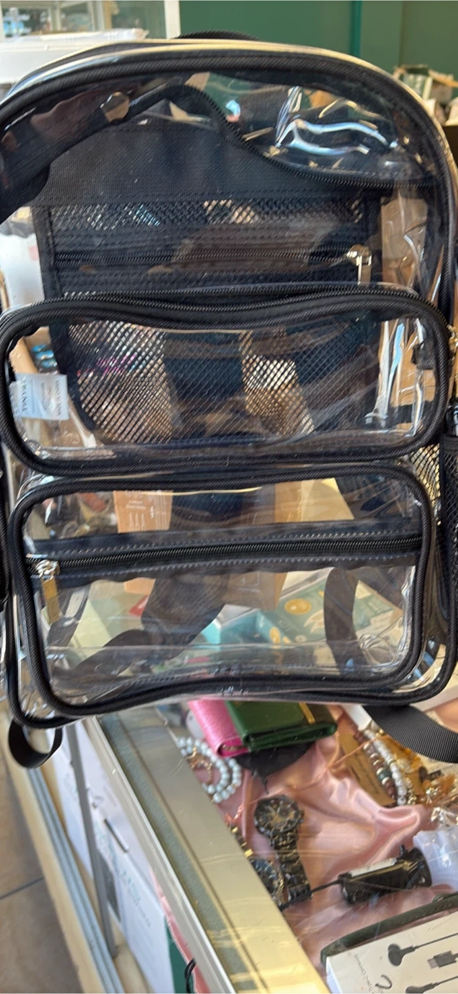 This is a clear backpack designed with multiple zippered compartments for organized storage. It features a durable construction and adjustable straps for comfort. This backpack is perfect for events with clear bag policies or for easy organization of your belongings.