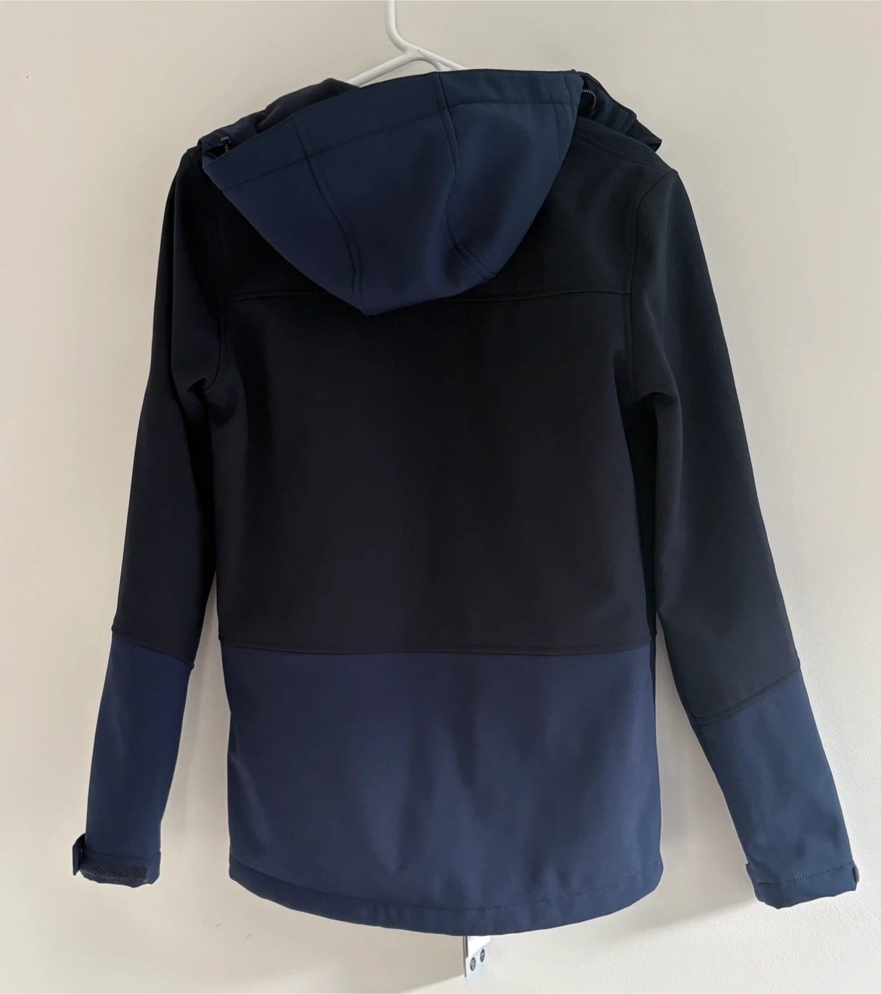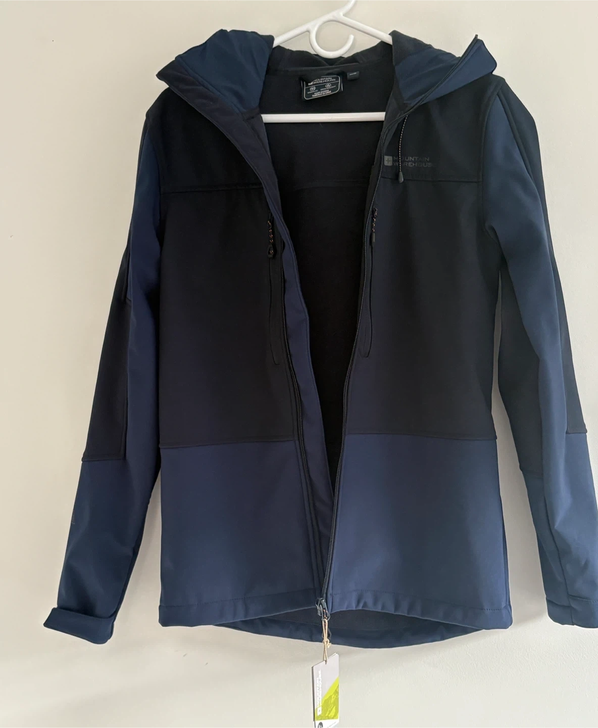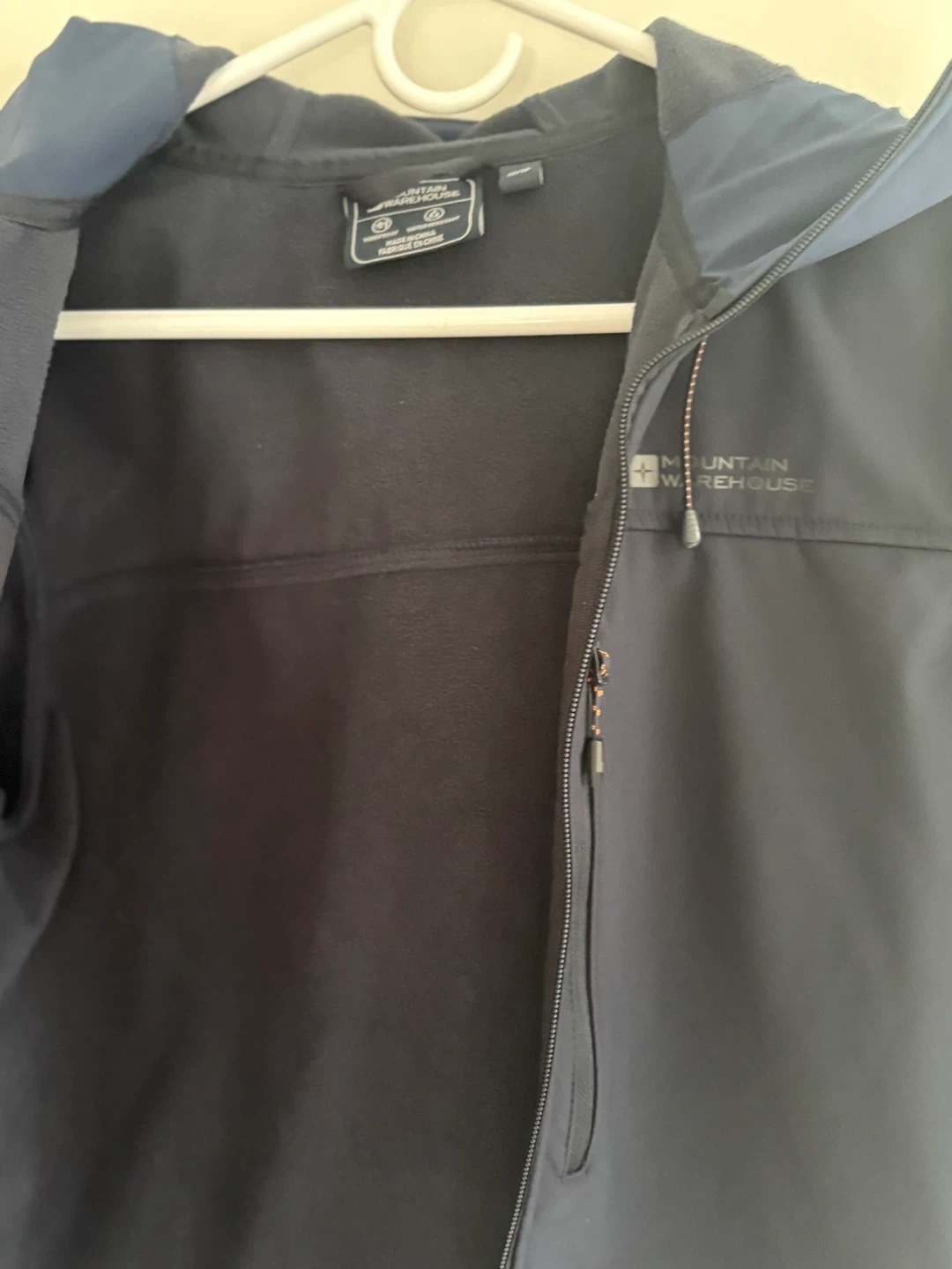 This Mountain Warehouse softshell jacket is a navy blue colour. It's a hooded jacket with a full zip and multiple pockets. Great for outdoor activities!