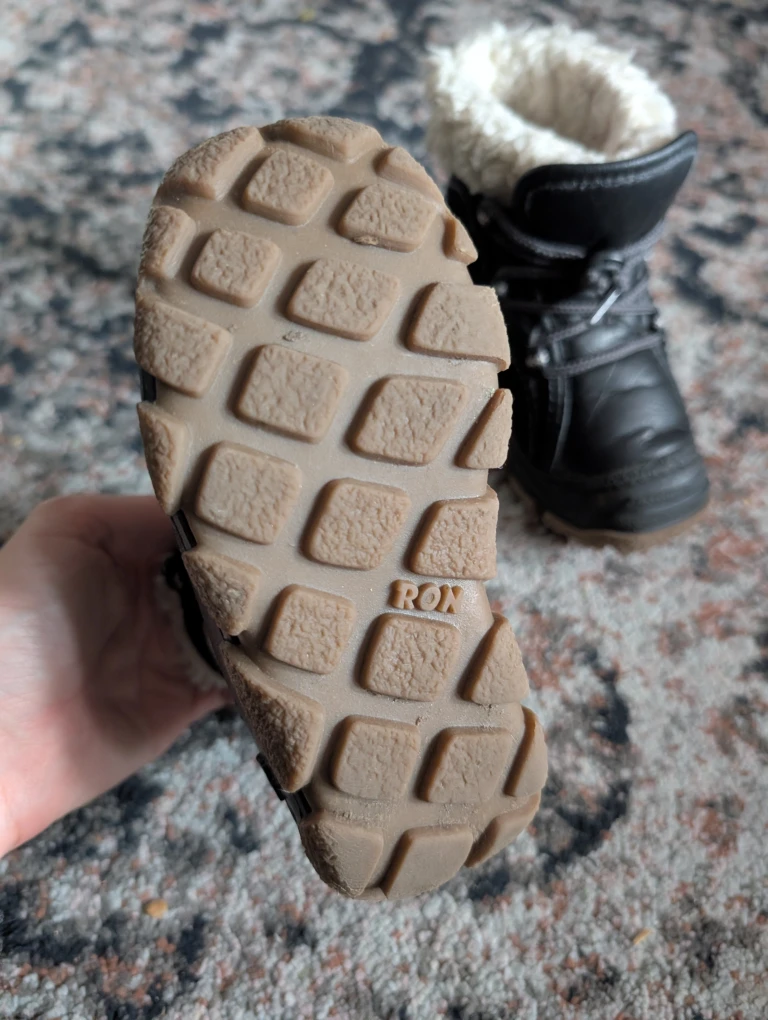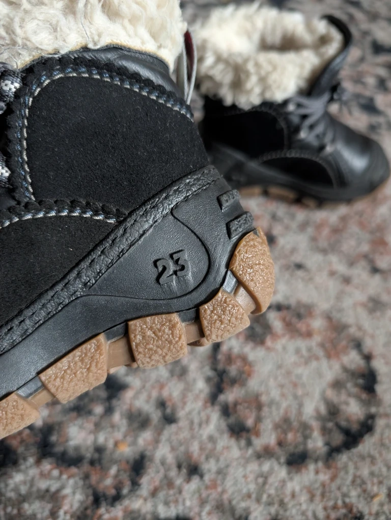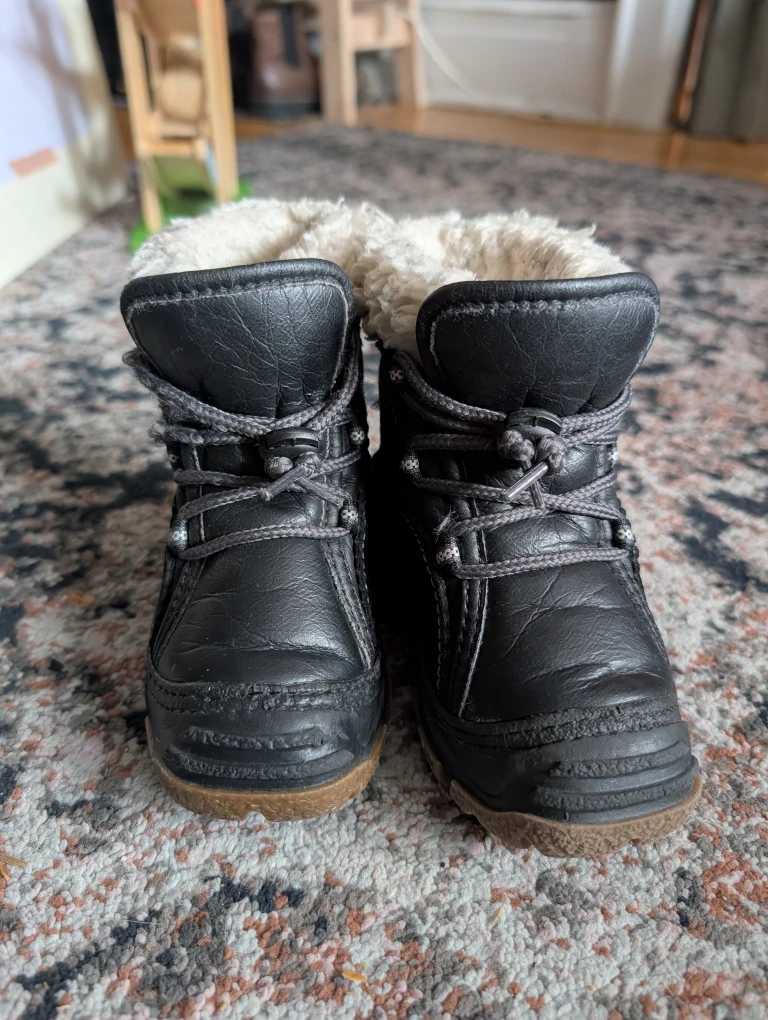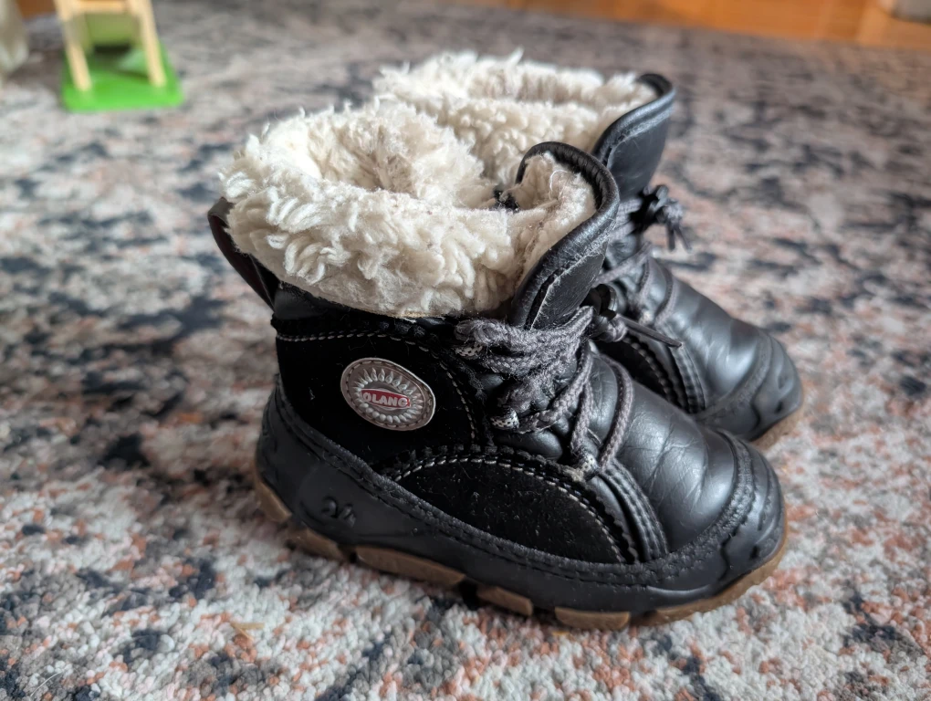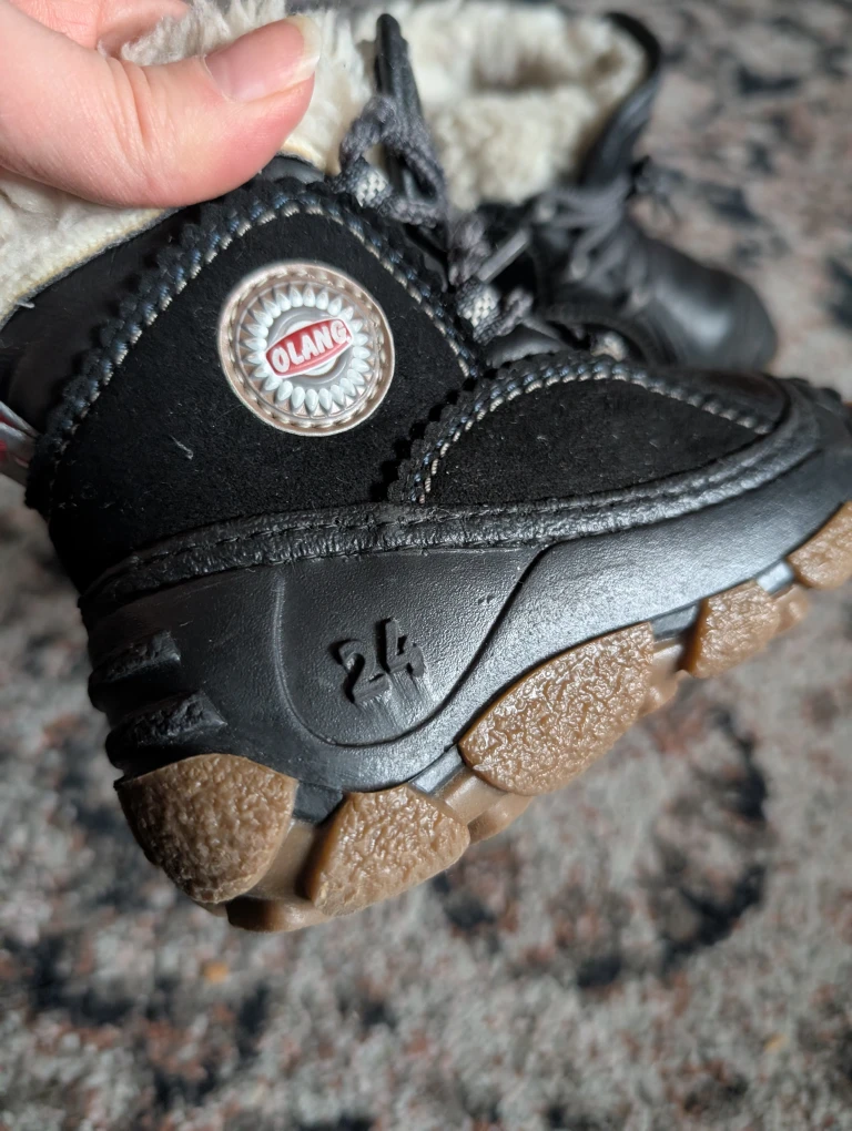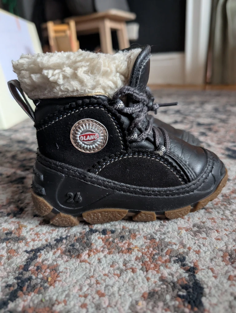 Cozy Olang winter boots in black, perfect for keeping little feet warm and dry! They are in great condition and ready for winter adventures. Worn for one winter. These are great for kids who tend to be clumsy in shoes. Our child didn't trip in these which was a big concern for us. They are truly awesome boots. Originally $98 plus tax.