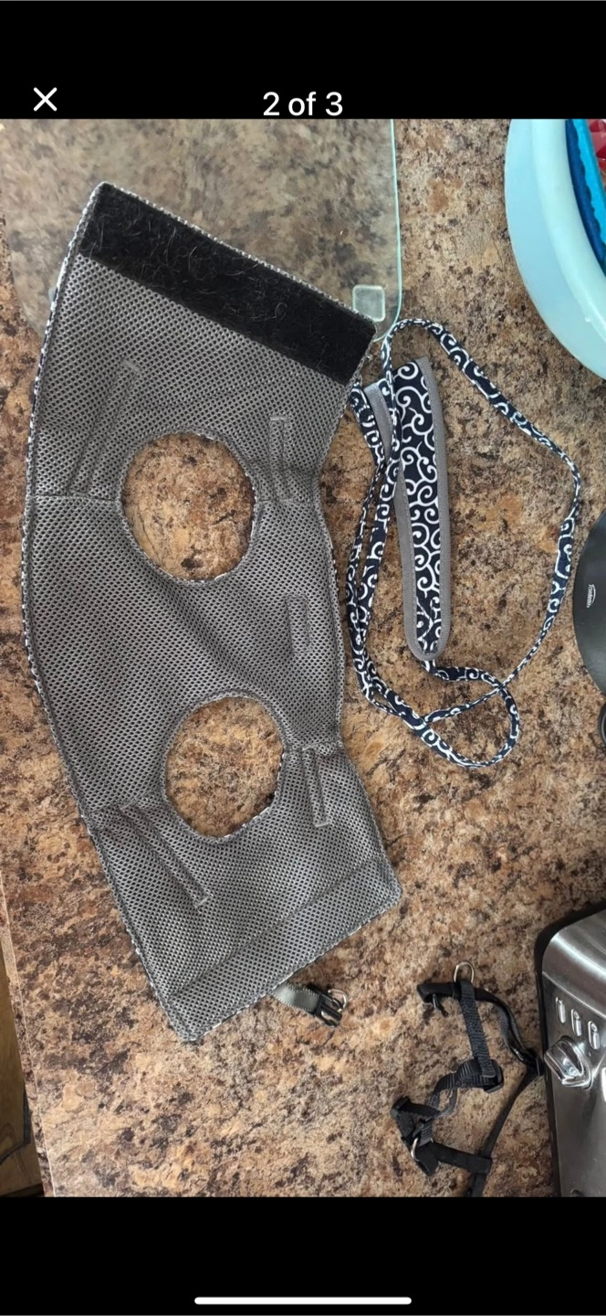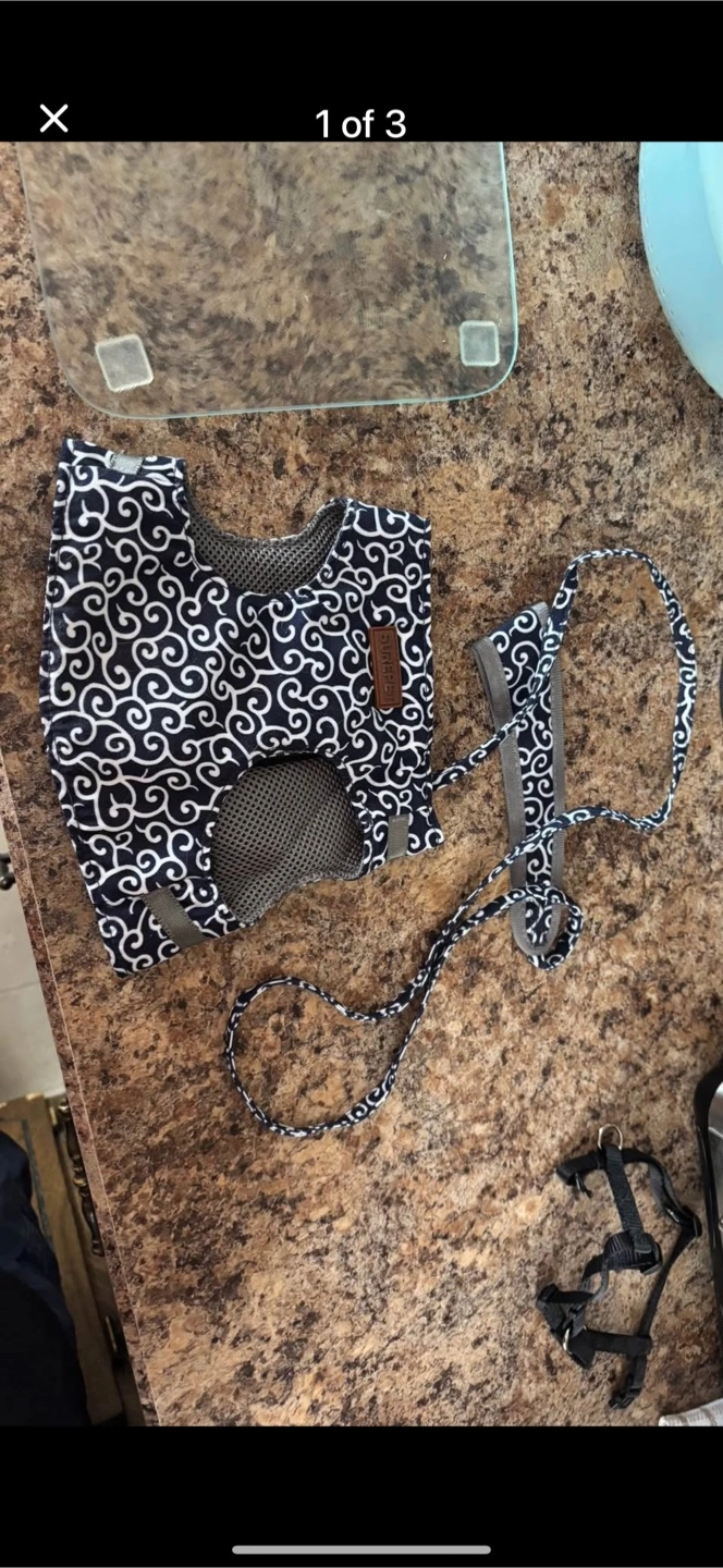 Adorable large cat harness and leash set. Features a breathable mesh design. Stylish dark blue and white pattern. Great for walking your furry friend. $35 obo cash only