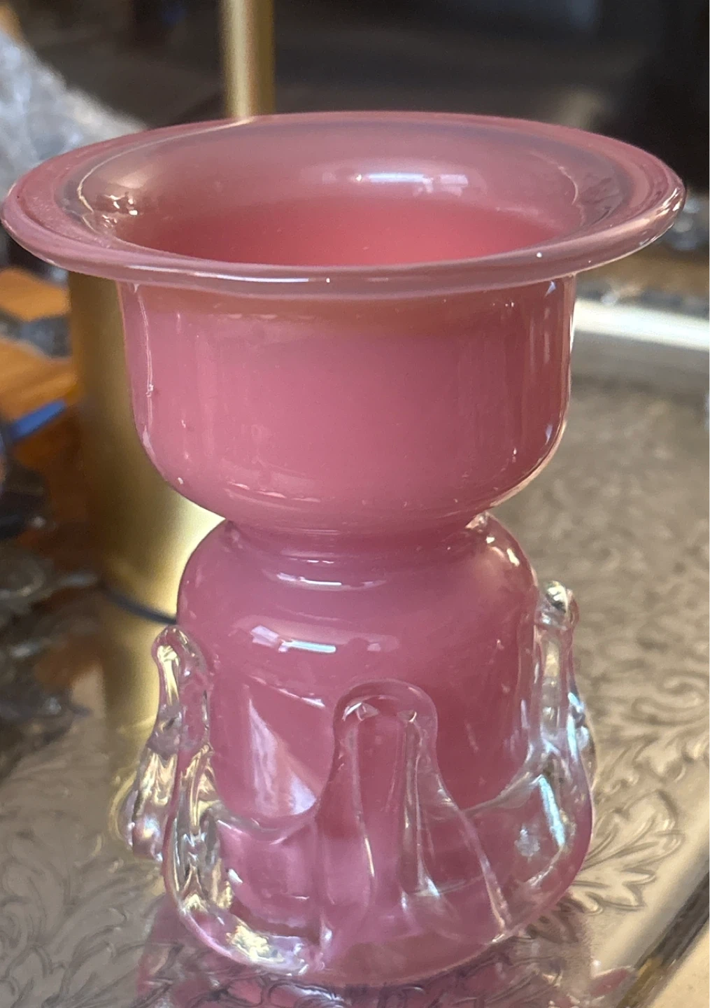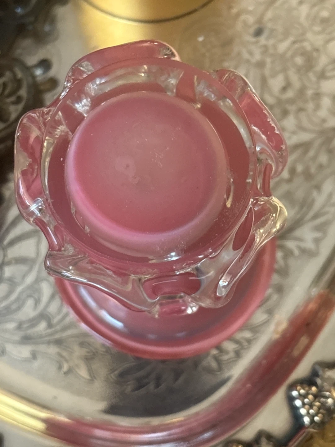 Pretty pink glass candlestick holder with a rose-like design. It's perfect for adding a touch of vintage charm to any room. This holder is suitable for taper candles.