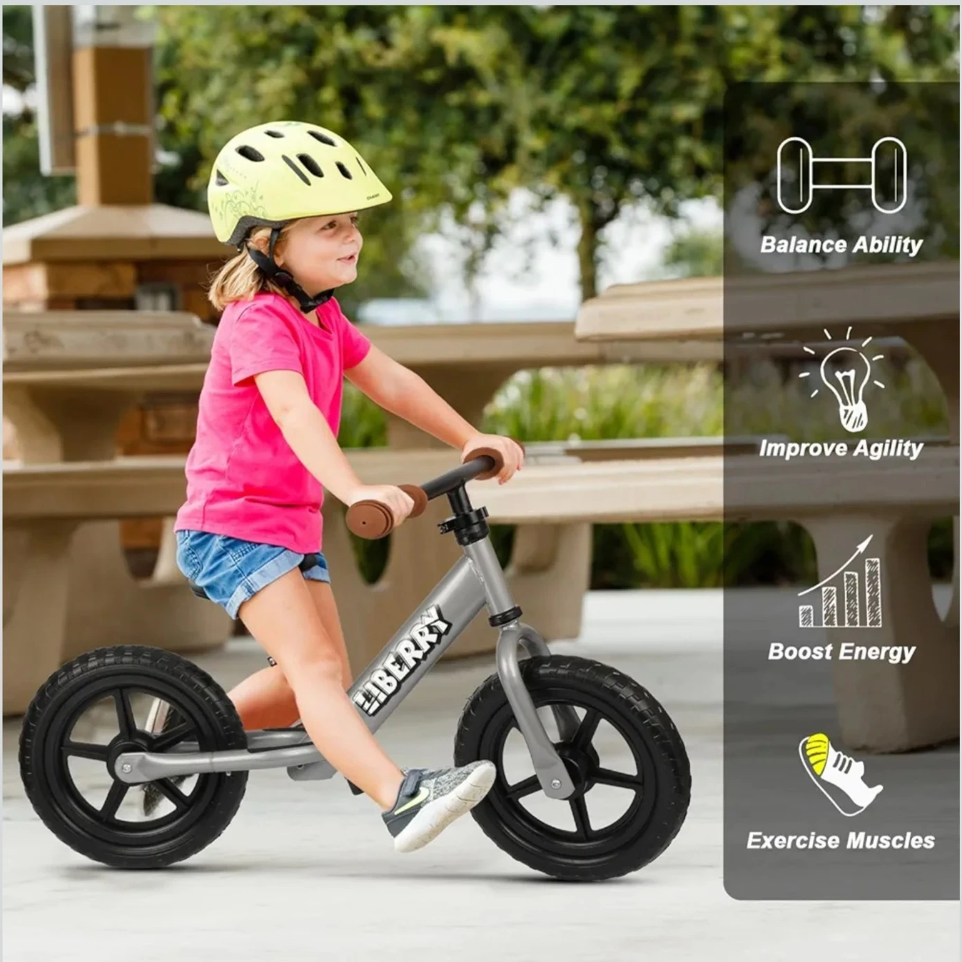 I'm selling a brand new Hiberry balance bike! It features a sturdy steel frame and anti-puncture tires, so kids can ride freely and safely on different surfaces. It has a detachable plate, and comes with DIY stickers to unleash creativity with design. The non-slip footrest lets kids save energy and enjoy wonderful biking time. The adjustable handlebar and seat let kids find the most comfortable riding position for their height. It helps boost energy, improve agility, and exercise muscles!