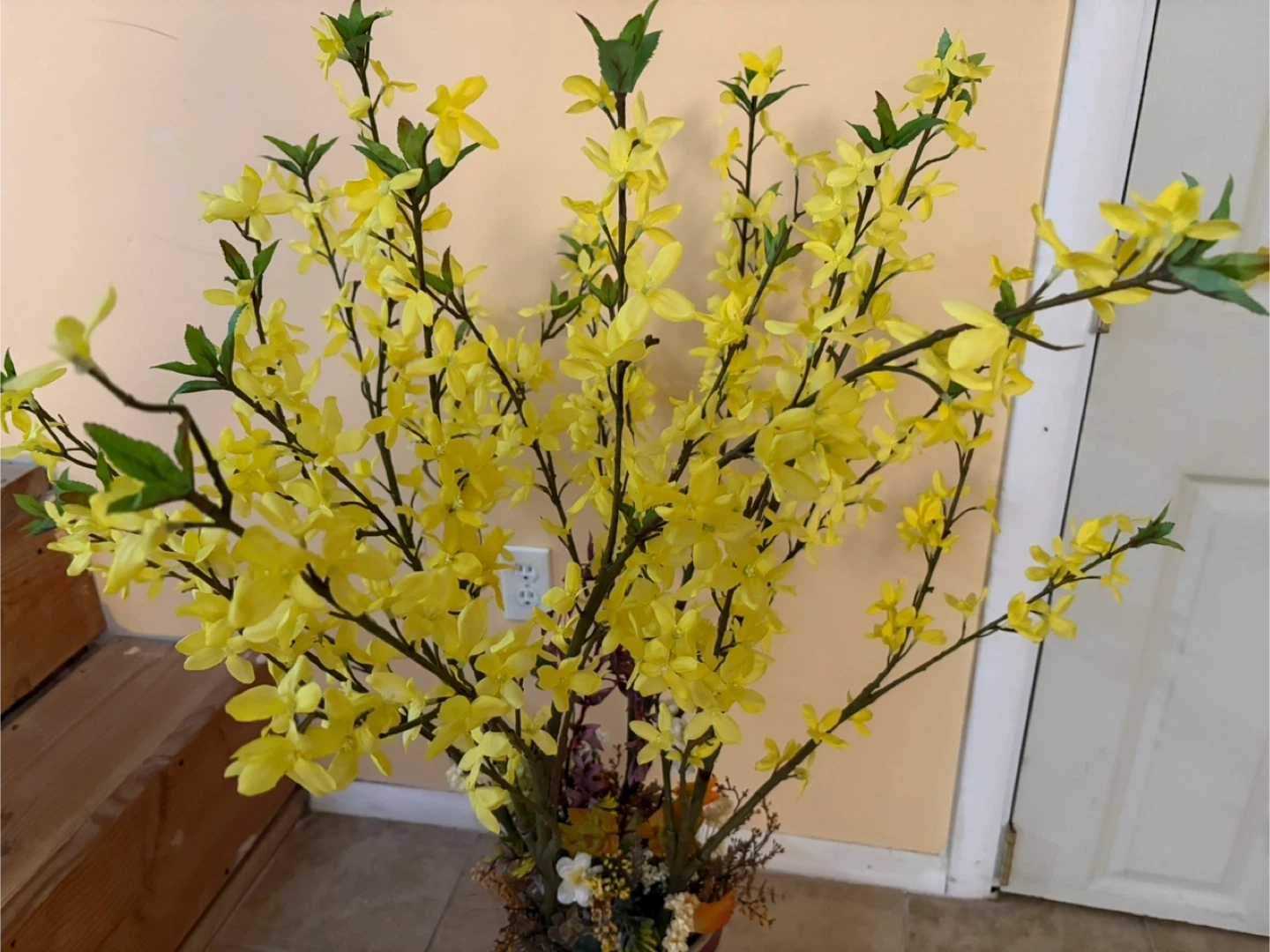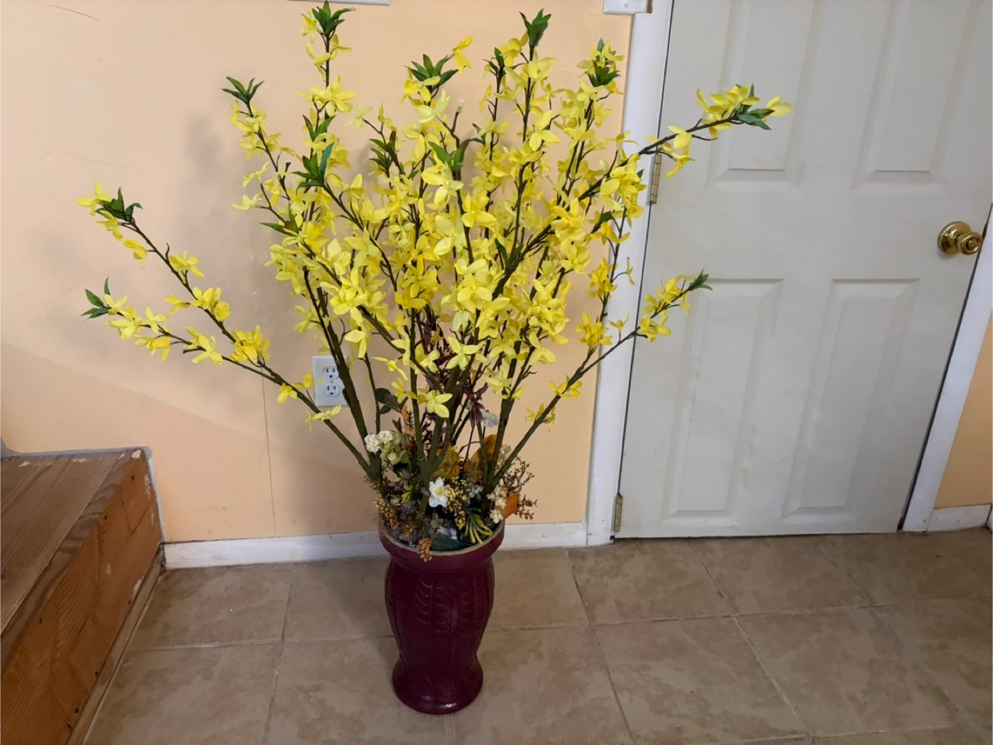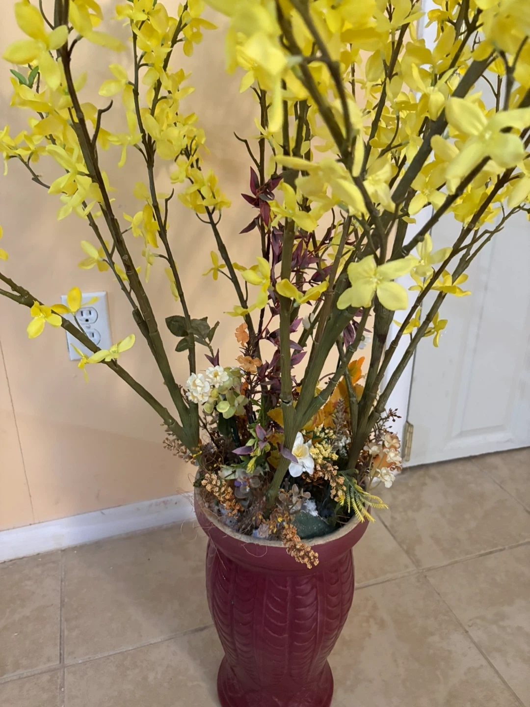Artificial Yellow Forsythia Floral Arrangement in Burgundy Vase