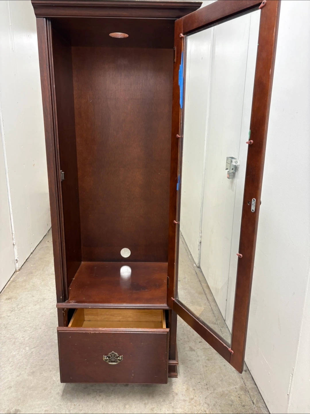 Selling a dark wood display cabinet with a glass door and a drawer at the bottom. It's in good condition and would be great for displaying collectibles or storing items. There's a hole in the back panel. Perfect for any room!