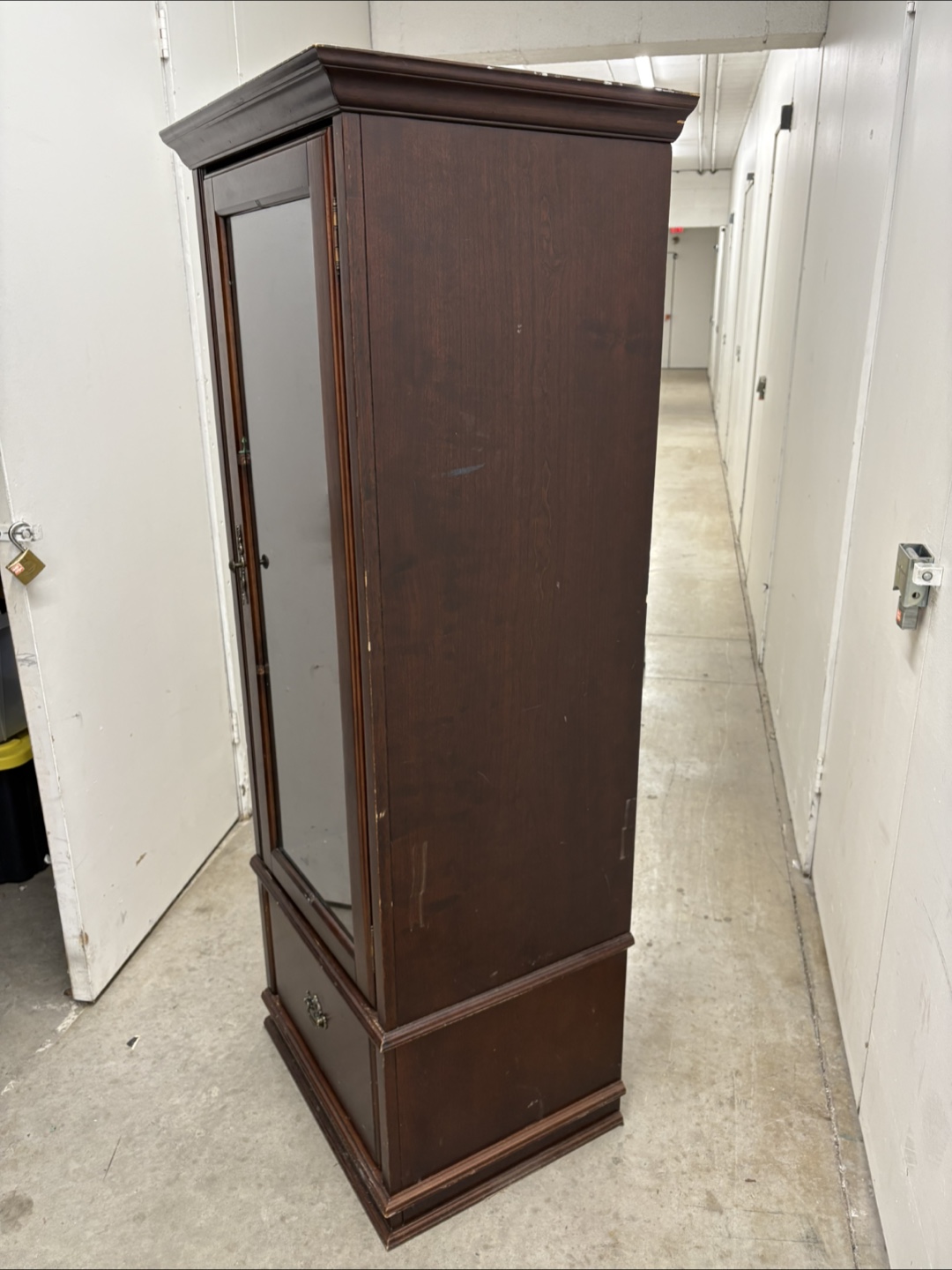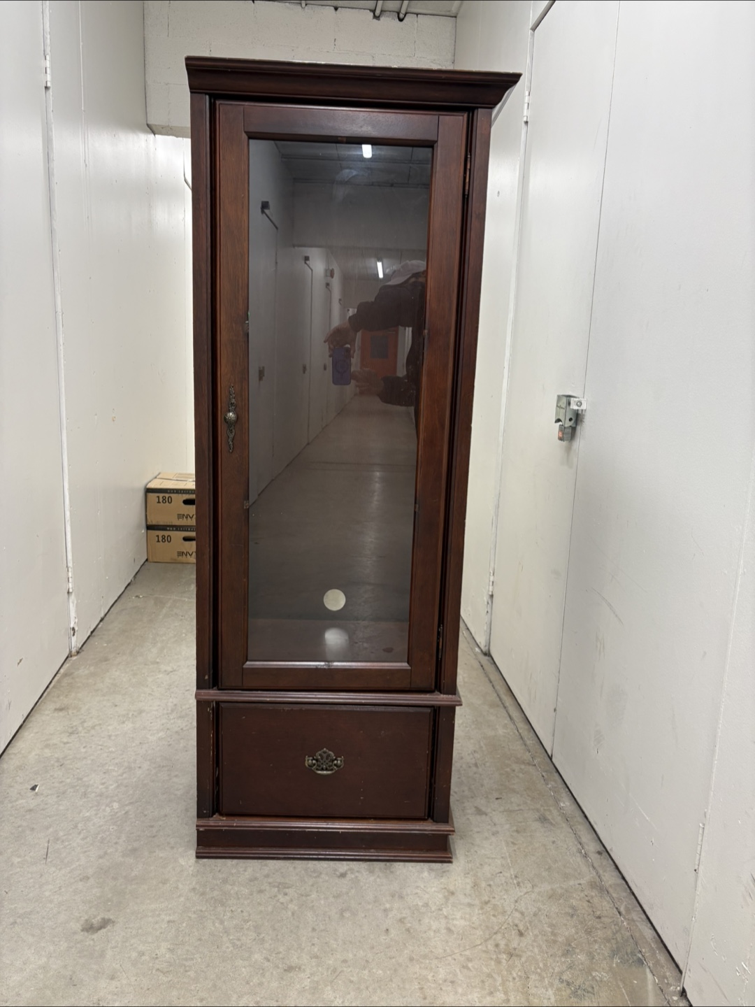 Selling a dark wood display cabinet with a glass door and a drawer at the bottom. It's in good condition and would be great for displaying collectibles or storing items. There's a hole in the back panel. Perfect for any room!