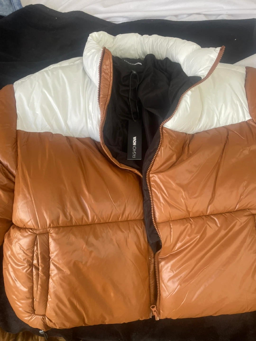 Fashion Nova puffer jacket in a two-tone brown and white design. It's a stylish and warm outerwear piece. Features a zip-up front and pockets.