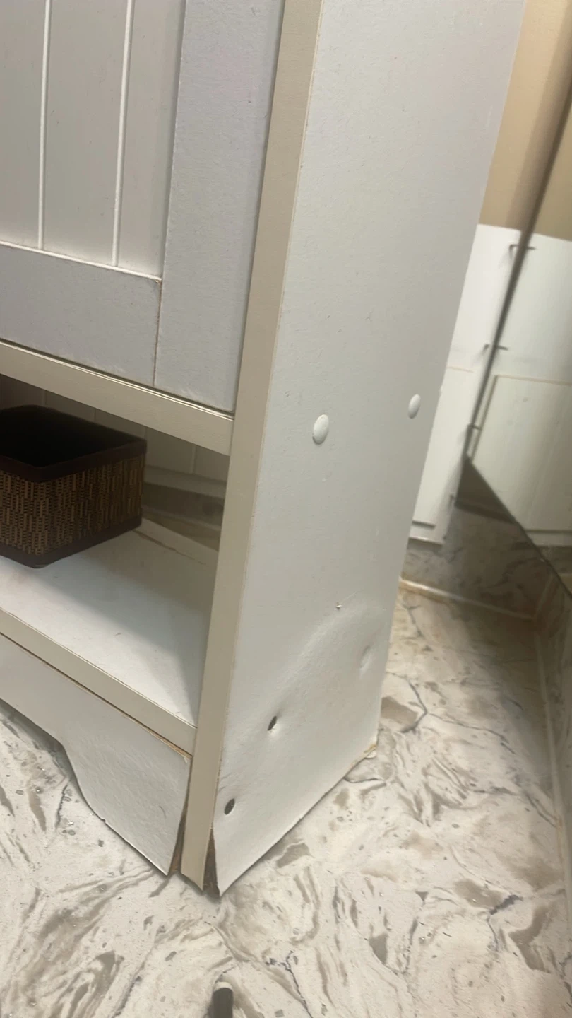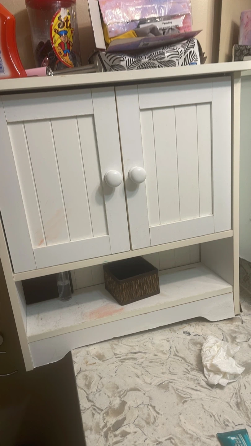 White bathroom storage cabinet with two doors and an open shelf. It has visible scuffs and dents on the lower side, as well as some pink marks on the doors and shelf. Measures approximately 24 inches wide and 30 inches tall.