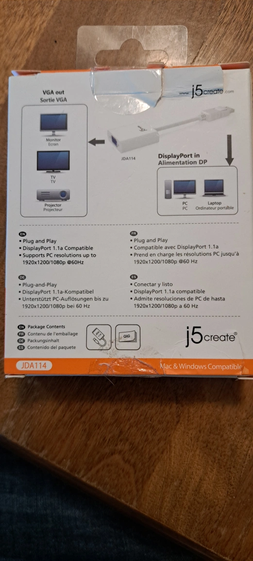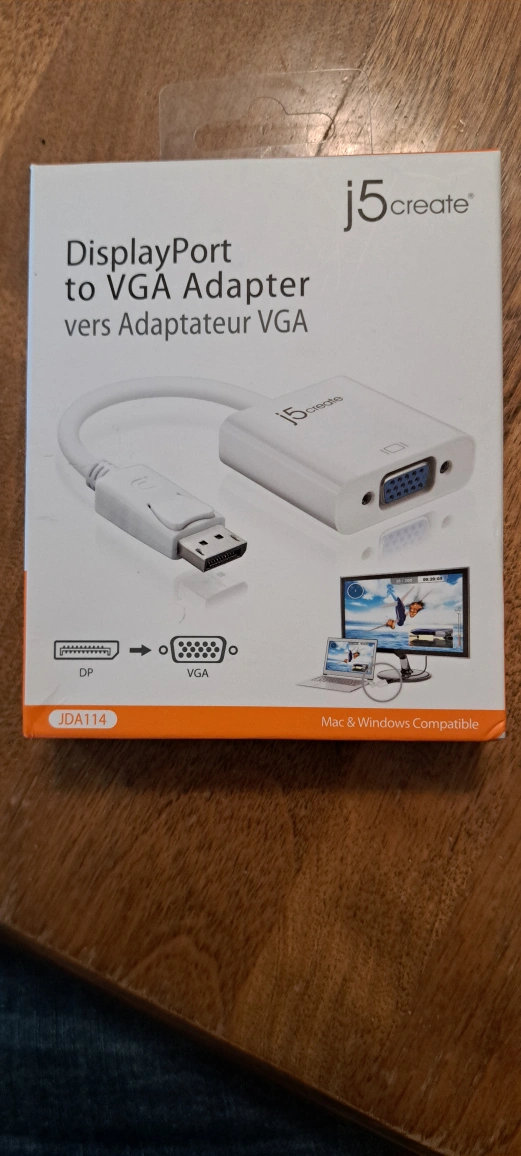 Selling a brand new j5create DisplayPort to VGA adapter, still in its original packaging! It's compatible with Mac & Windows, and supports PC resolutions up to 1920x1200/1080p @60 Hz. Plug and play for easy use! Package contents are included.