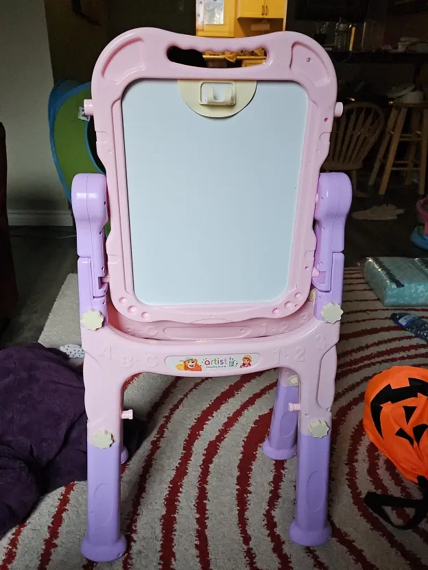 This double-sided easel is pink and purple, perfect for little artists. It's a drawing board with a whiteboard and chalkboard. This easel would be great for inspiring creativity in young children!