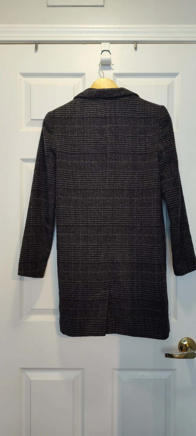 A stylish women's blazer coat in a classic grey plaid pattern. It features a single-button closure and a silky smooth lining. Perfect for layering over outfits for a polished look!