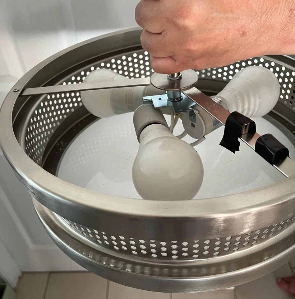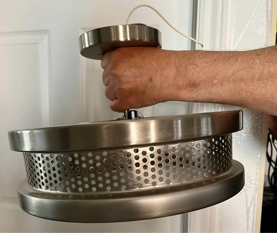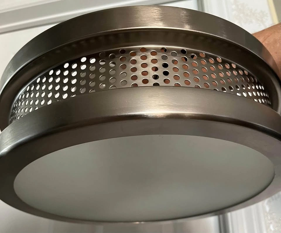 Modern lamp in chrome and glass with 3 lights. Perfect for hallways or short ceiling rooms. In excellent condition. 34 cm round x 24 cm high (13-1/2” x 9-1/2”). Pick up Schomberg (Hwy 9 at Hwy 27)