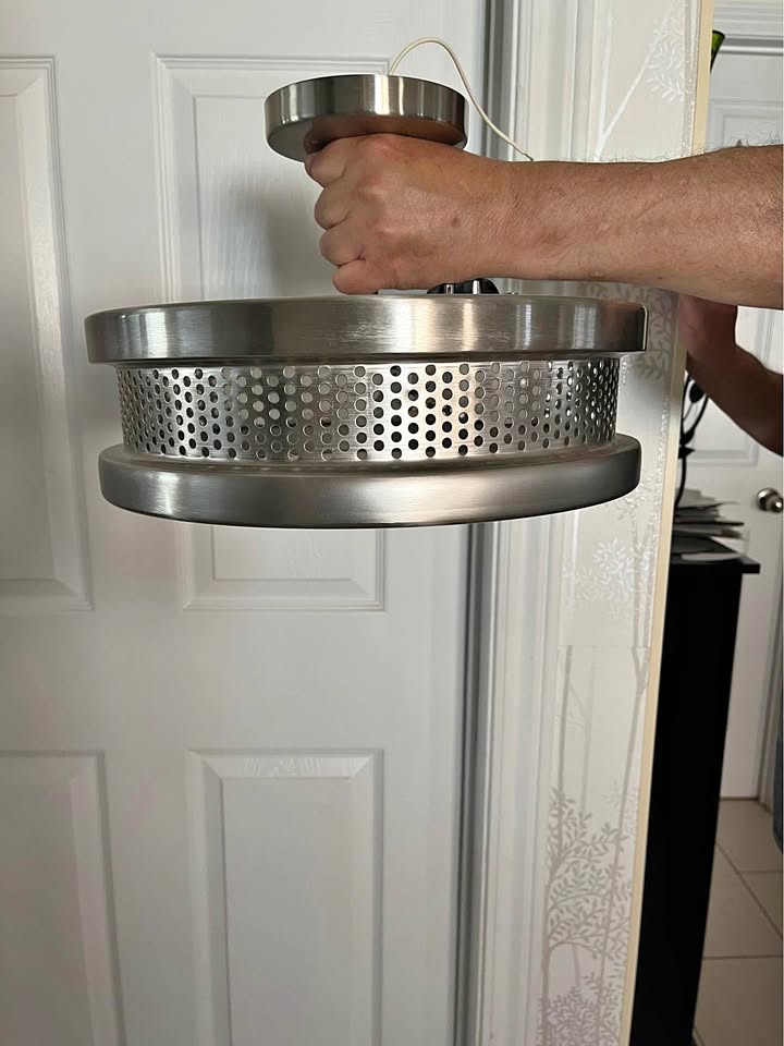 Modern lamp in chrome and glass with 3 lights. Perfect for hallways or short ceiling rooms. In excellent condition. 34 cm round x 24 cm high (13-1/2” x 9-1/2”). Pick up Schomberg (Hwy 9 at Hwy 27)