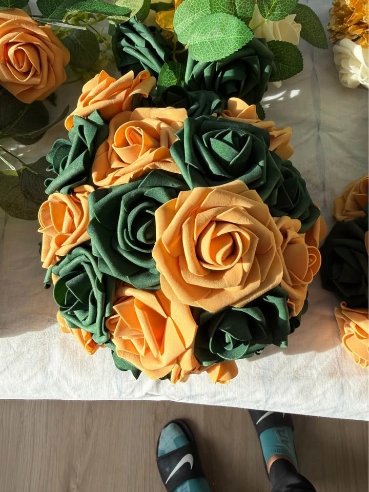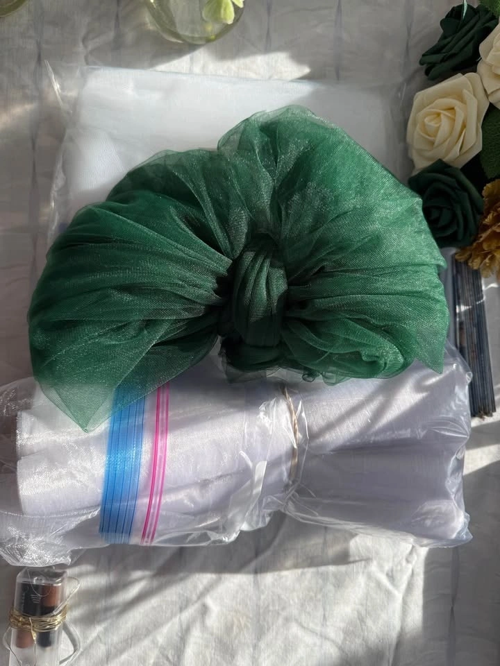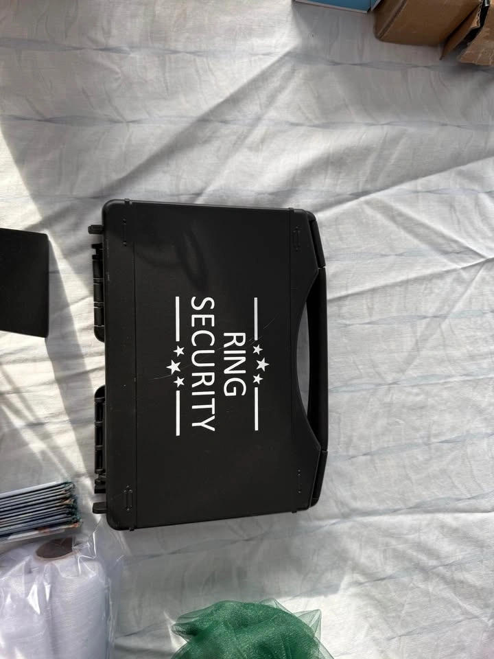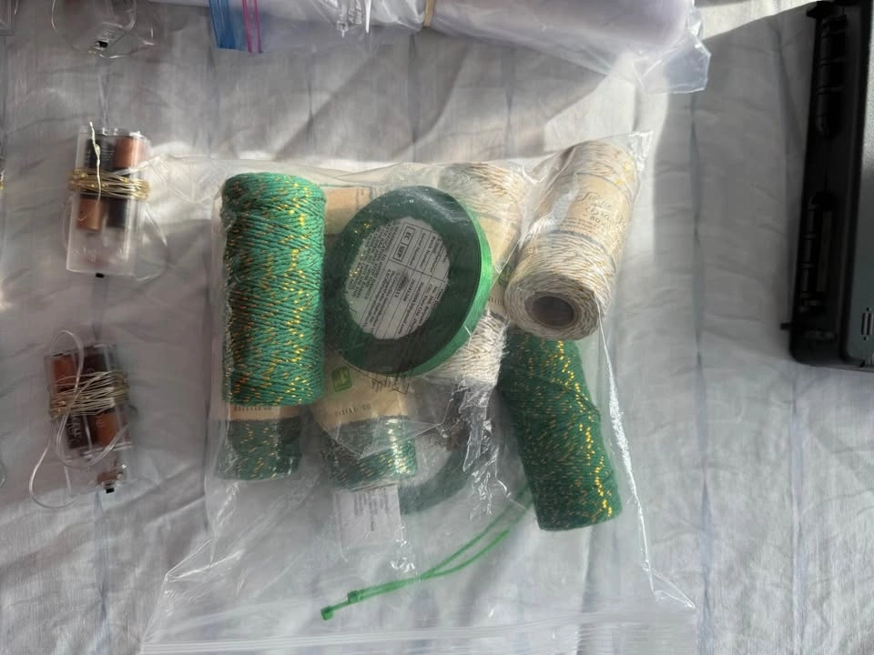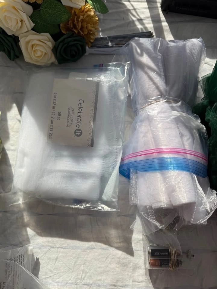 We're selling a collection of gently used wedding decorations, perfect for couples looking to add a personal touch to their special day. This bundle includes 13 mini lights, a ring security box, a rustic brown photo frame, tulle in various lengths and sizes, faux flower pieces for table decor, and strings used for thank you gifts. Visit my page for other wedding items.