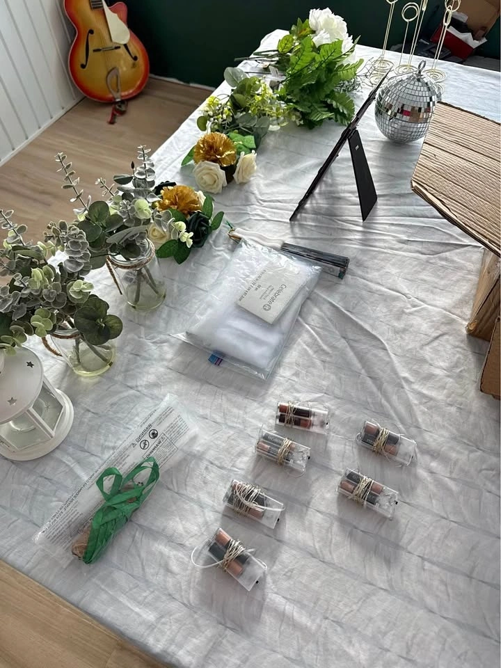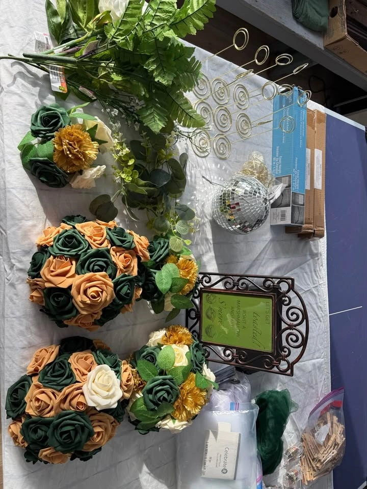 We're selling a collection of gently used wedding decorations, perfect for couples looking to add a personal touch to their special day. This bundle includes 13 mini lights, a ring security box, a rustic brown photo frame, tulle in various lengths and sizes, faux flower pieces for table decor, and strings used for thank you gifts. Visit my page for other wedding items.