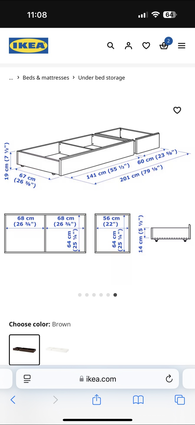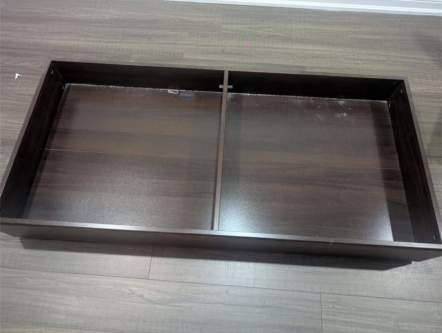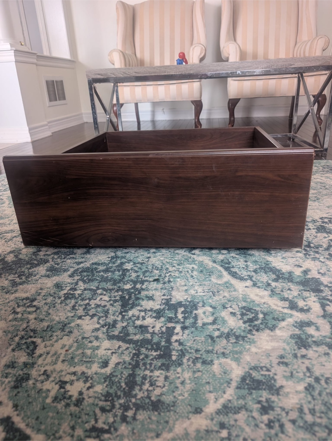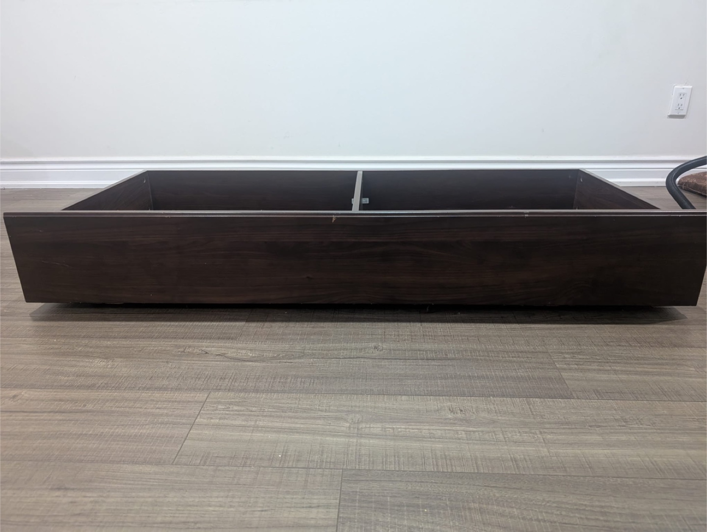 Set of three under-bed storage drawers. Brown colour. Excellent for storing extra blankets, clothing, or other items. Dimensions provided in image.