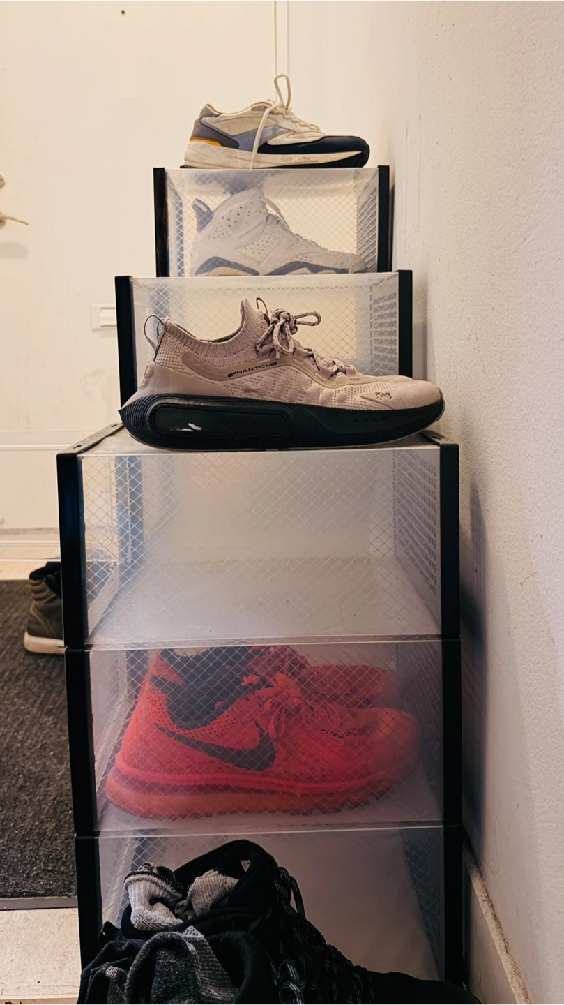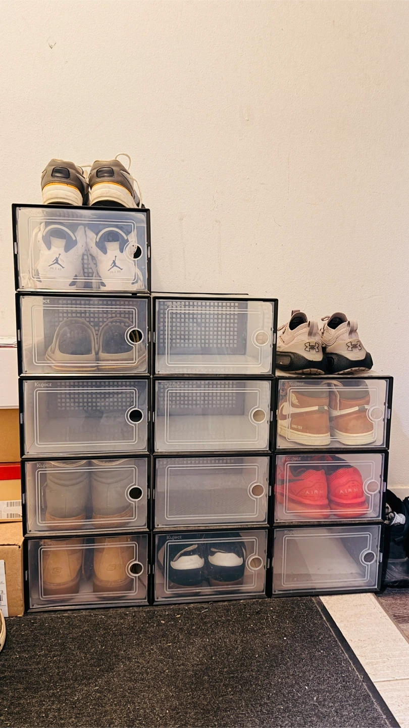 12 plastic Shoe storage boxes for sale! It's a great way to keep your shoes organized and protected from dust and damage. They are stackable and easy to assemble.