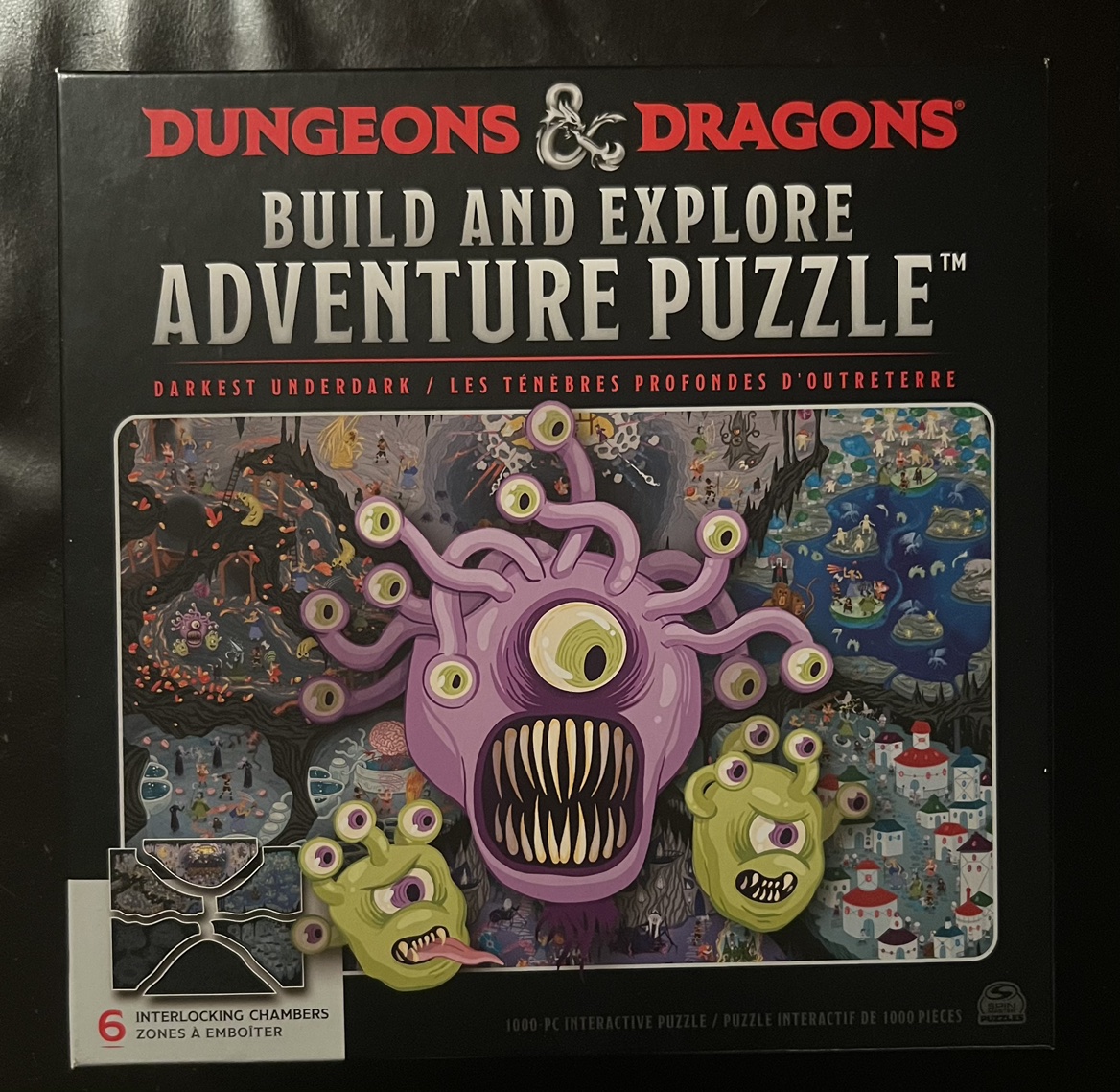 Dungeons & Dragons 1000 piece jigsaw puzzle with accompanying booklet. Booklet has story and guide for the puzzle. Complete with six puzzle sections and “random encounters” bag.
