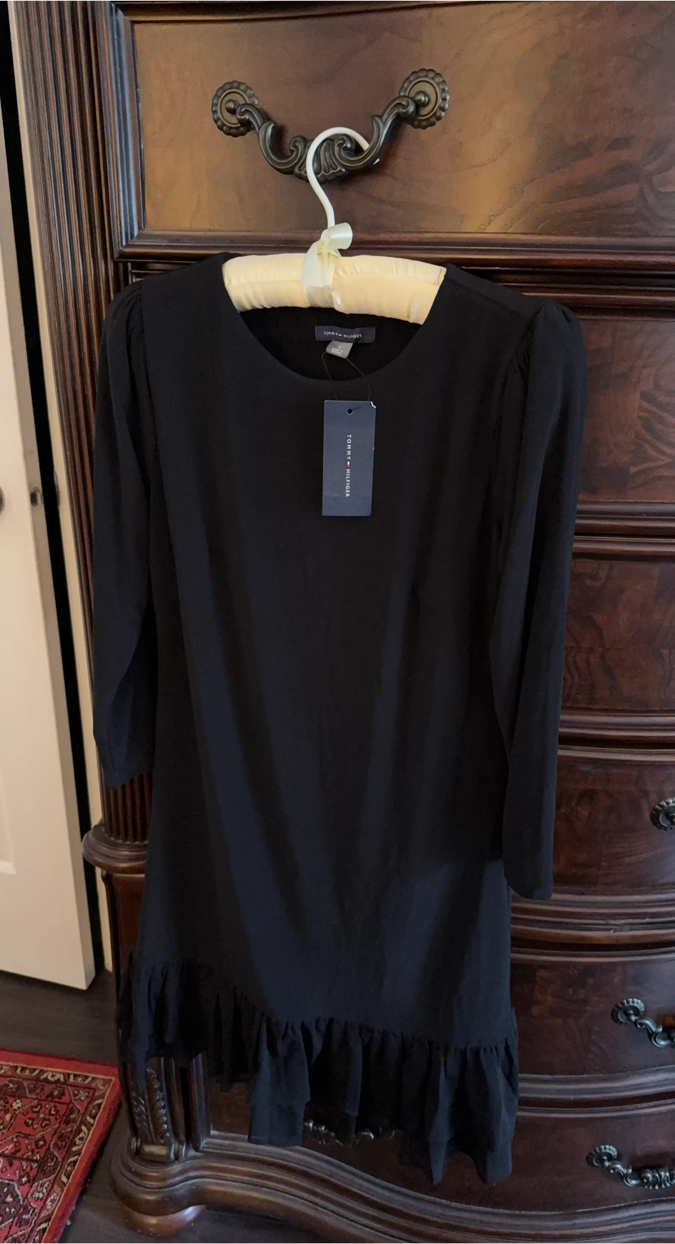 Tommy Hilfiger black dress with 3/4 sleeves and a ruffled hem. It's a size medium. Looks great for casual outings or dressing up!