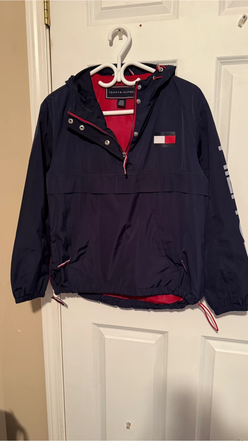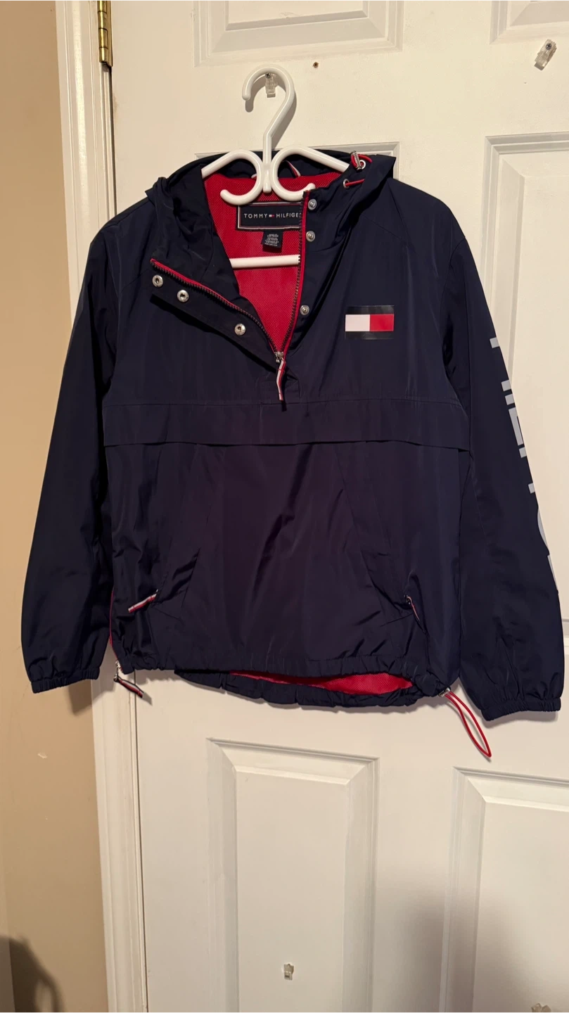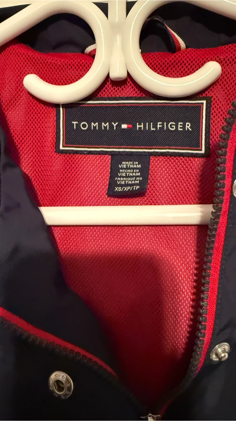 It's a Tommy Hilfiger anorak jacket in navy blue with a red lining. Made in Vietnam. Size is XS.