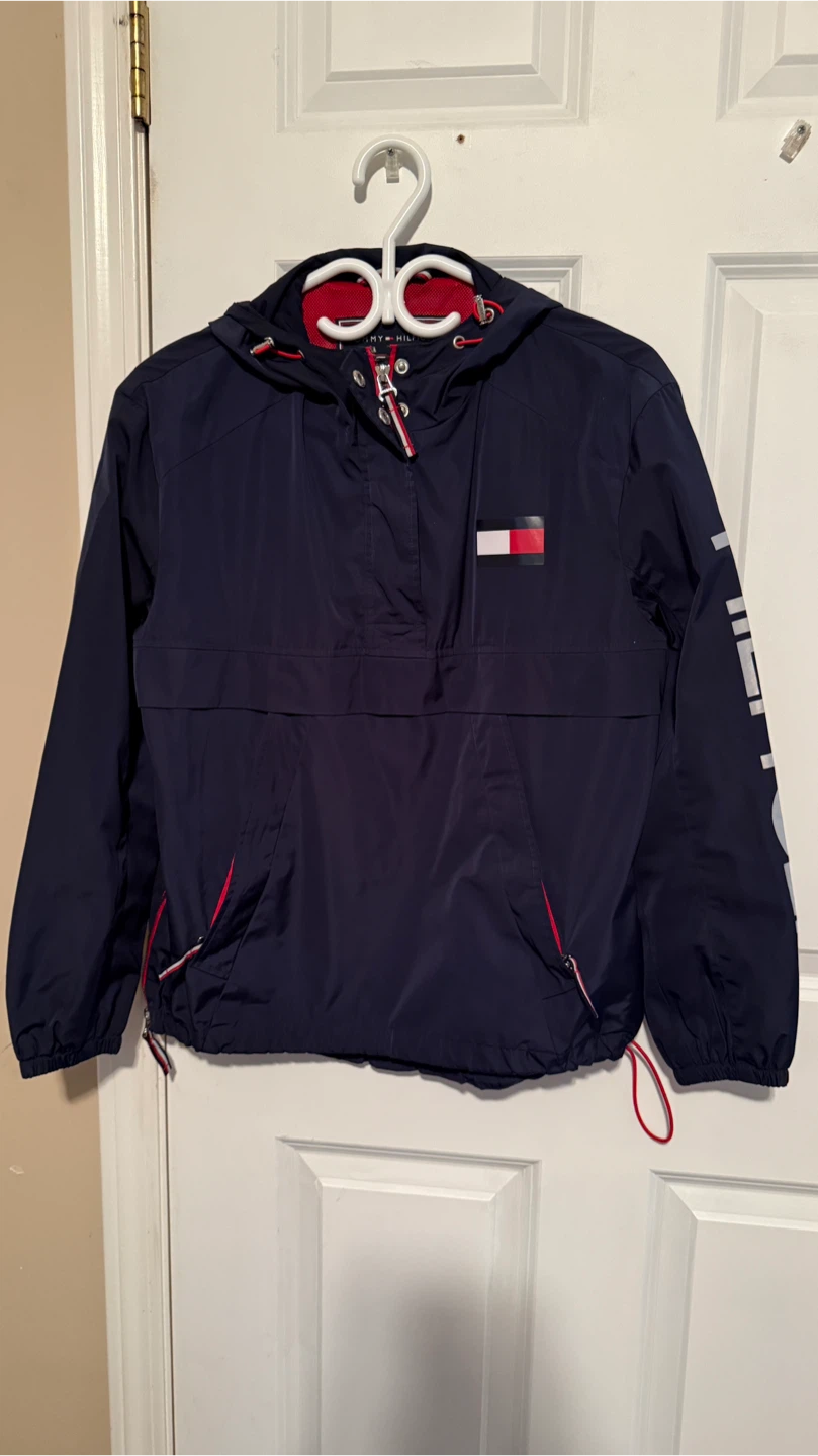 It's a Tommy Hilfiger anorak jacket in navy blue with a red lining. Made in Vietnam. Size is XS.