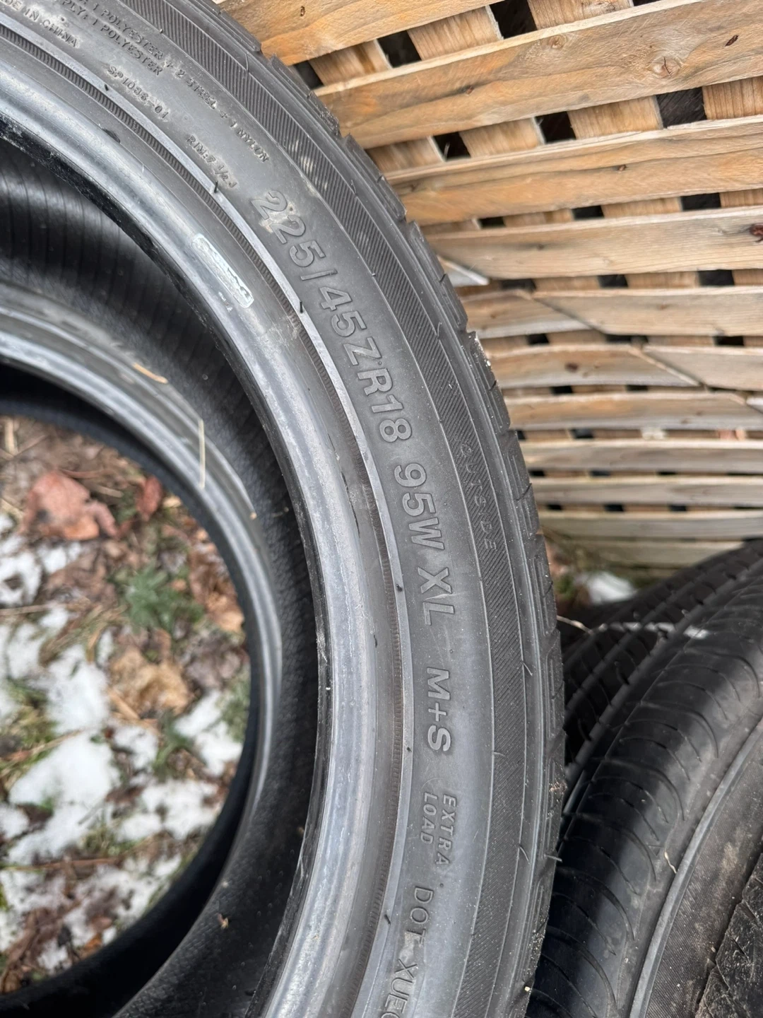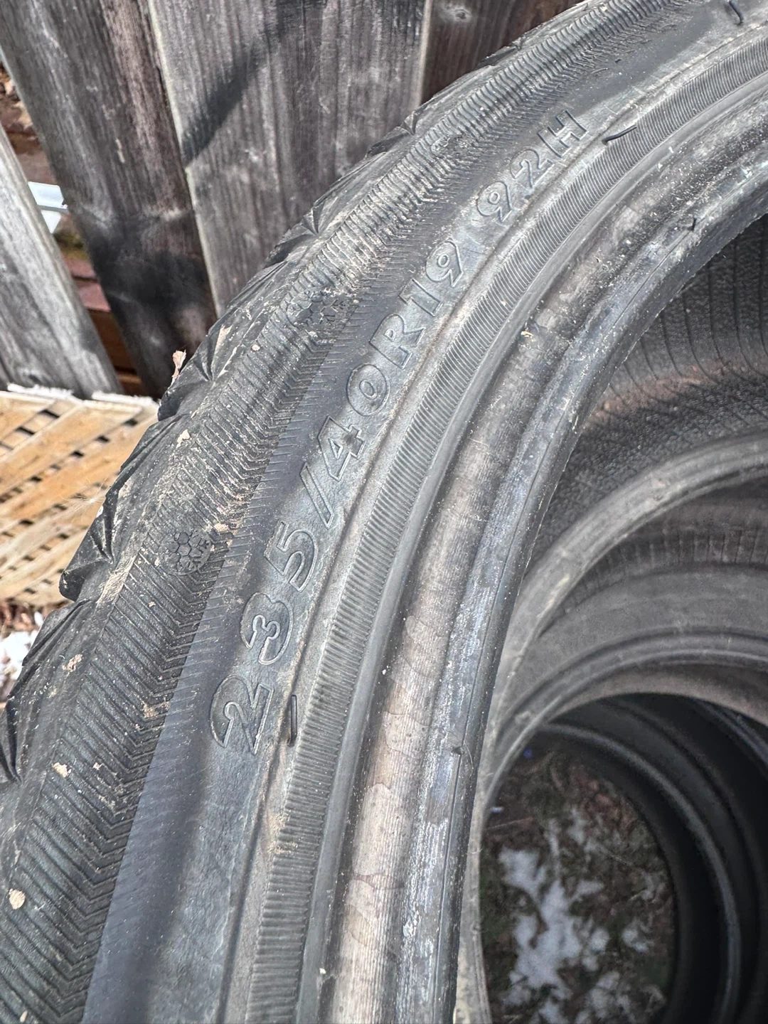 Assorted tired pairs and sets, two are 225/45ZR18 95W XL and two are 235/40R19 92H. All-season M+S tires. As is come have a look if you want any