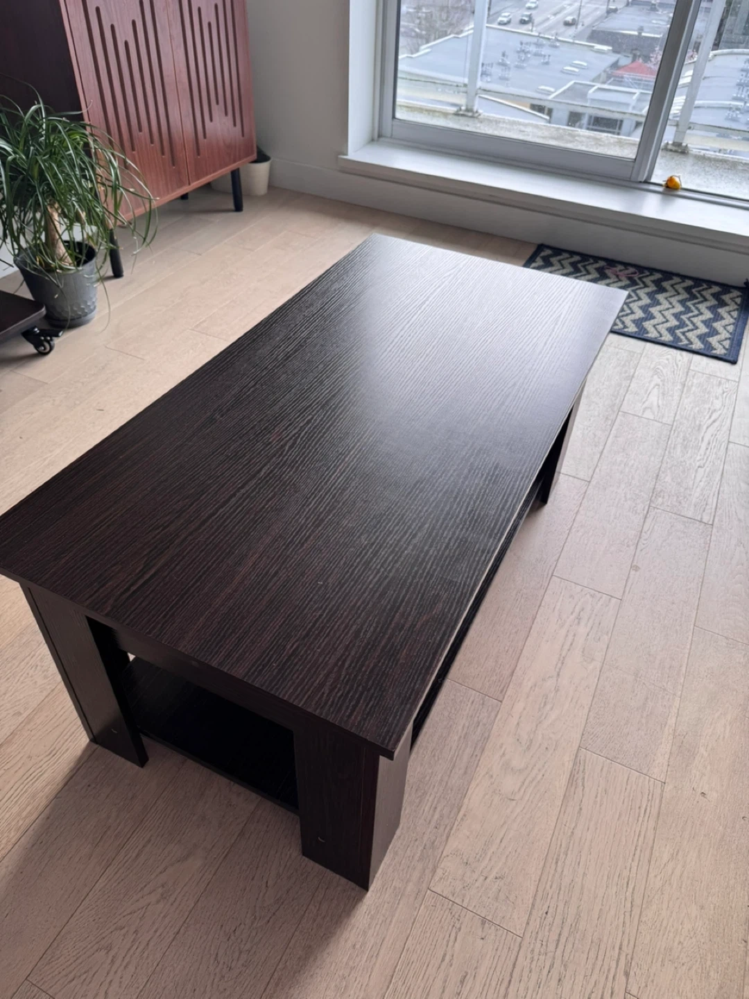 Dark wood finish lift-top coffee table with storage shelf. It has a lift-top mechanism for easy access to hidden storage. Great for small living spaces!