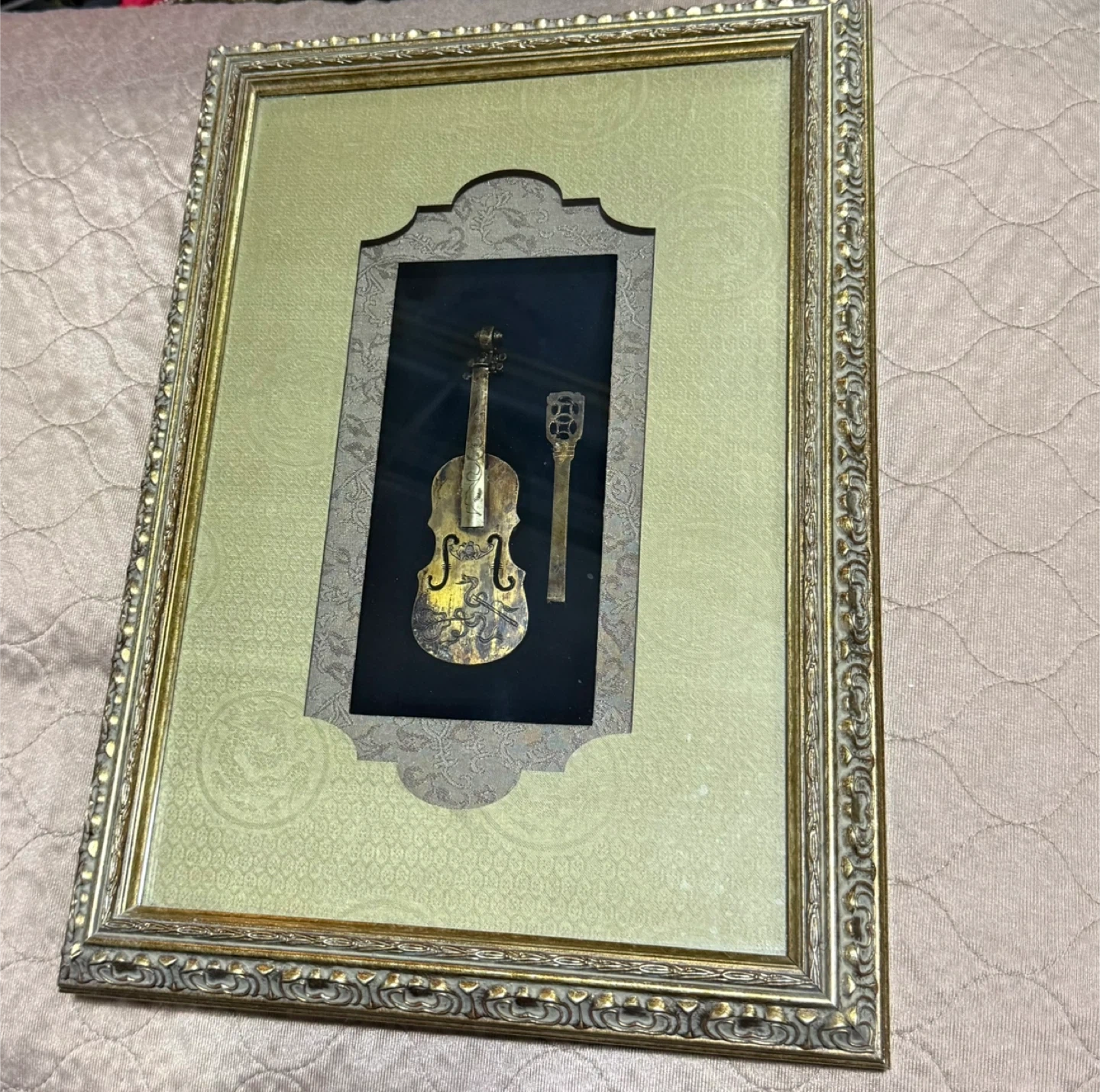 The display is housed in an ornate gold-coloured frame with a textured light green matting. It's a unique piece for any music lover's home.