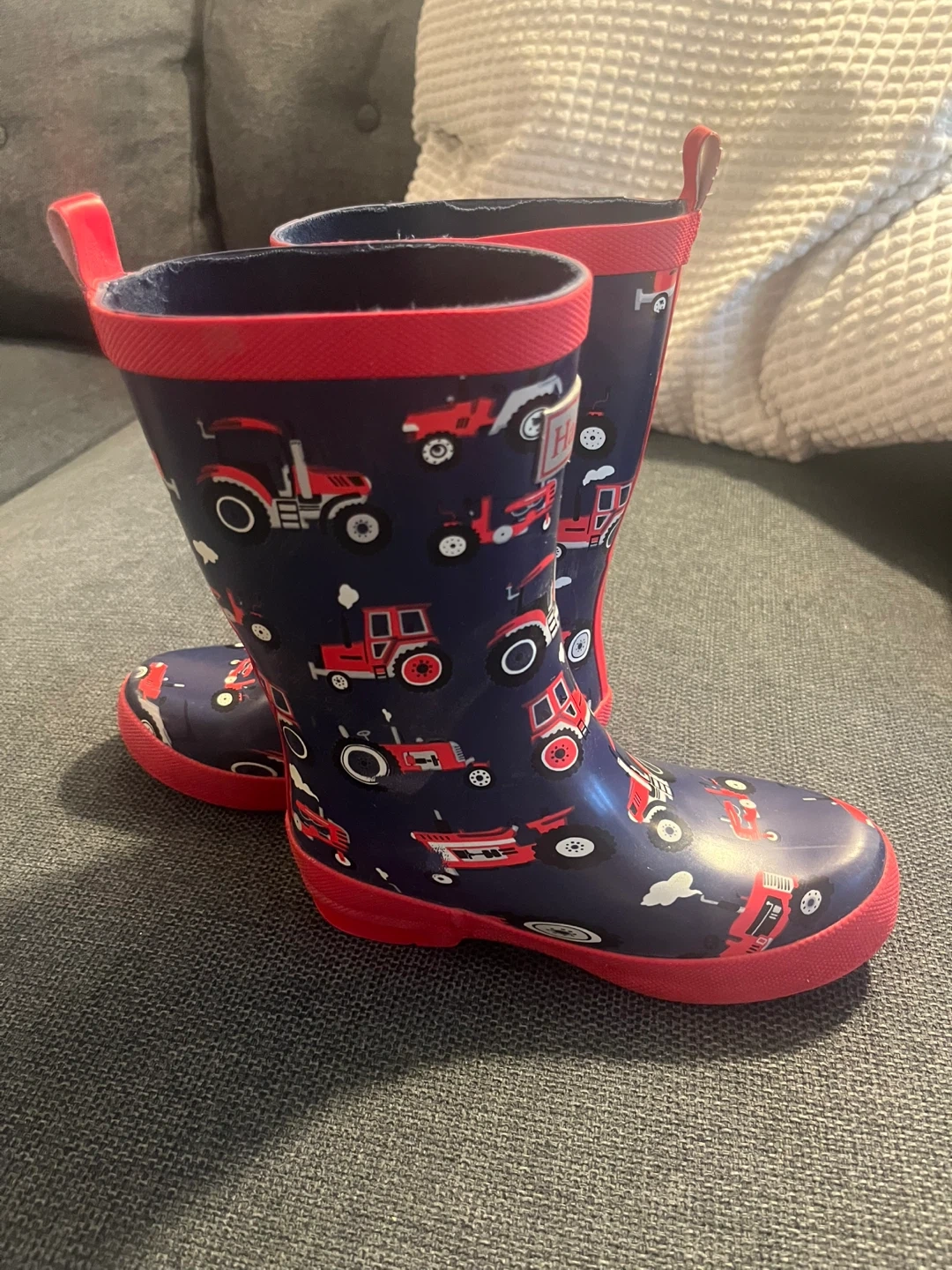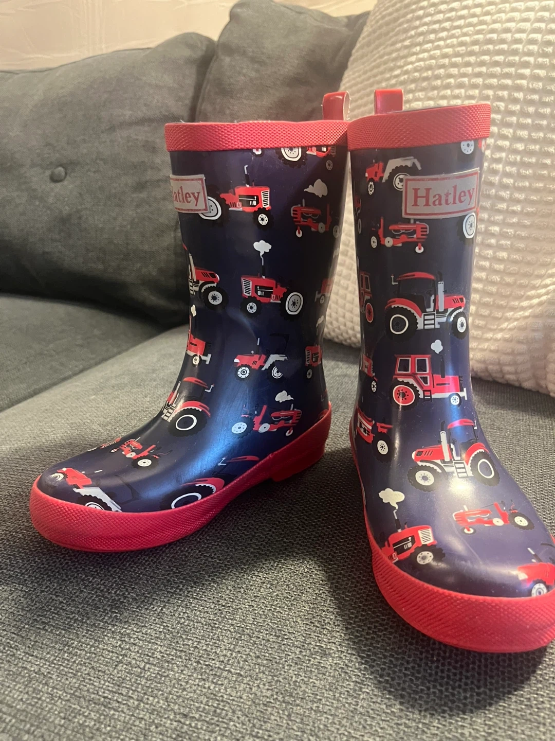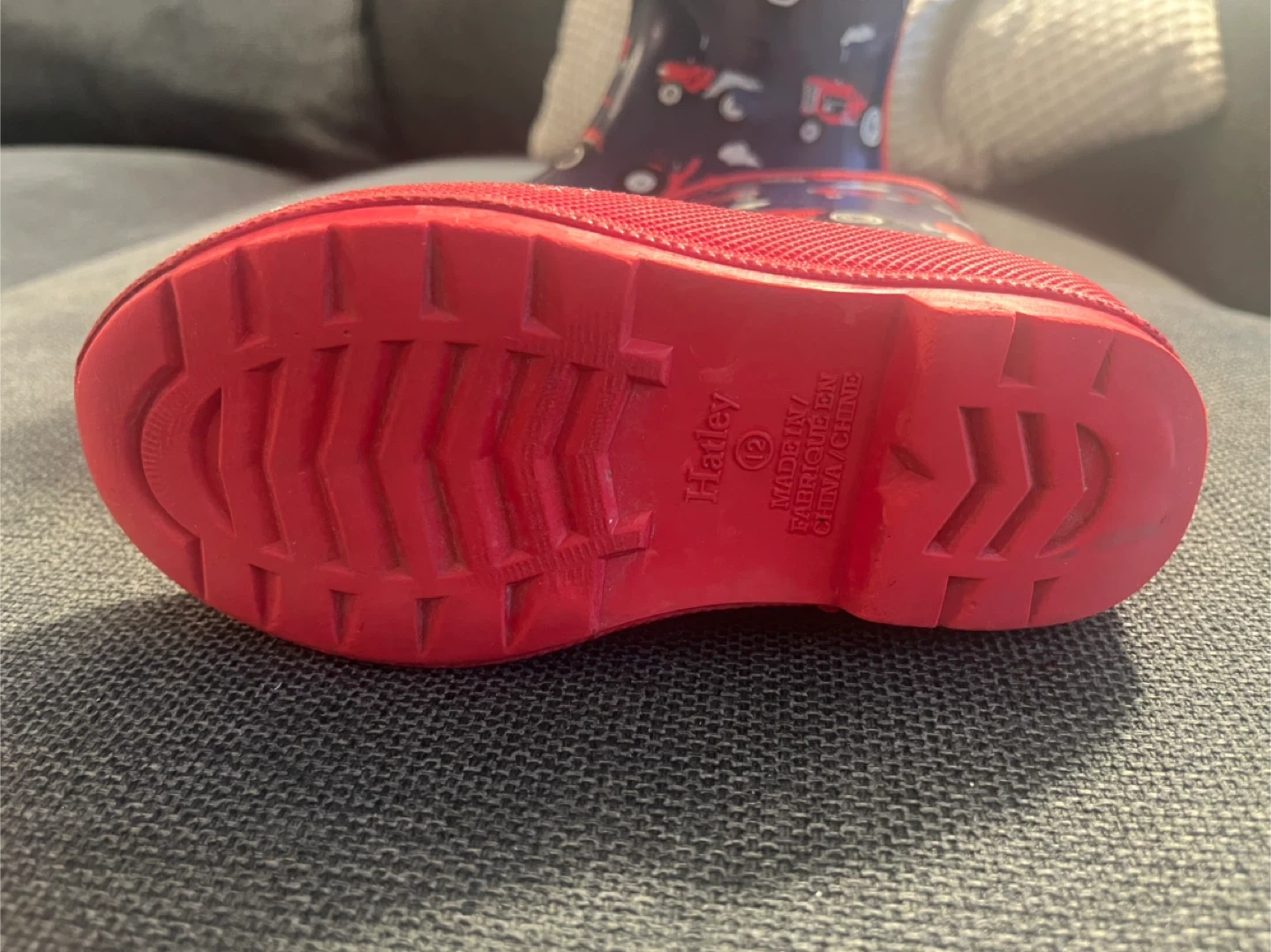 These navy blue Hatley rain boots feature a fun tractor print. They have red trim and soles. Perfect for splashing around in puddles! Kids size 12