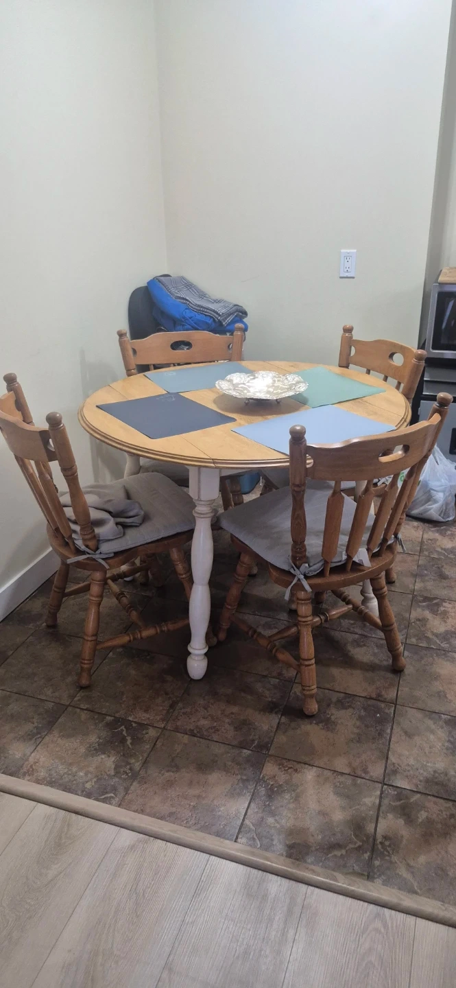 This dining set includes a round oak table and four wooden chairs with upholstered cushions. It's suitable for small dining areas. The table has a pedestal base. A decorative bowl is on the table.