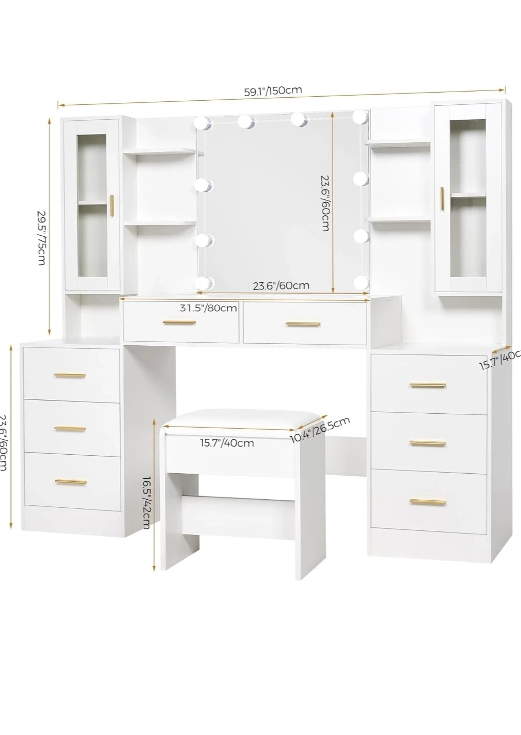 This white vanity table set includes a lighted mirror and a comfortable stool. It's constructed from particle board. The vanity measures 59.1"/150cm wide, 23.6"/60cm deep, and 59.1"/150cm tall. The stool measures 15.7"/40cm wide, 10.4"/26.5cm deep, and 16.5"/42cm tall. Plenty of storage drawers and cabinets are included!
