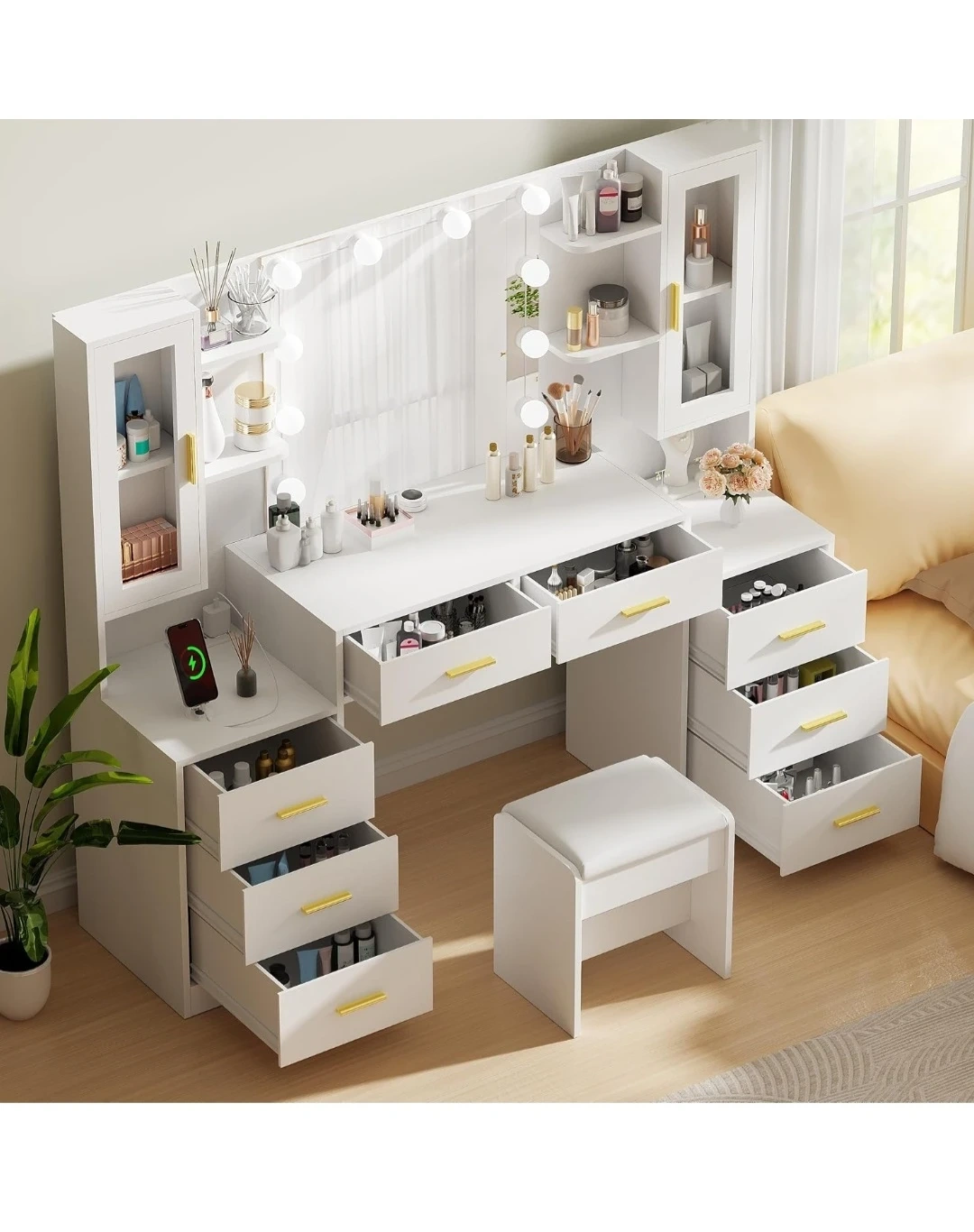 White Vanity Table with Lighted Mirror and Stool