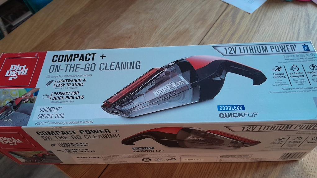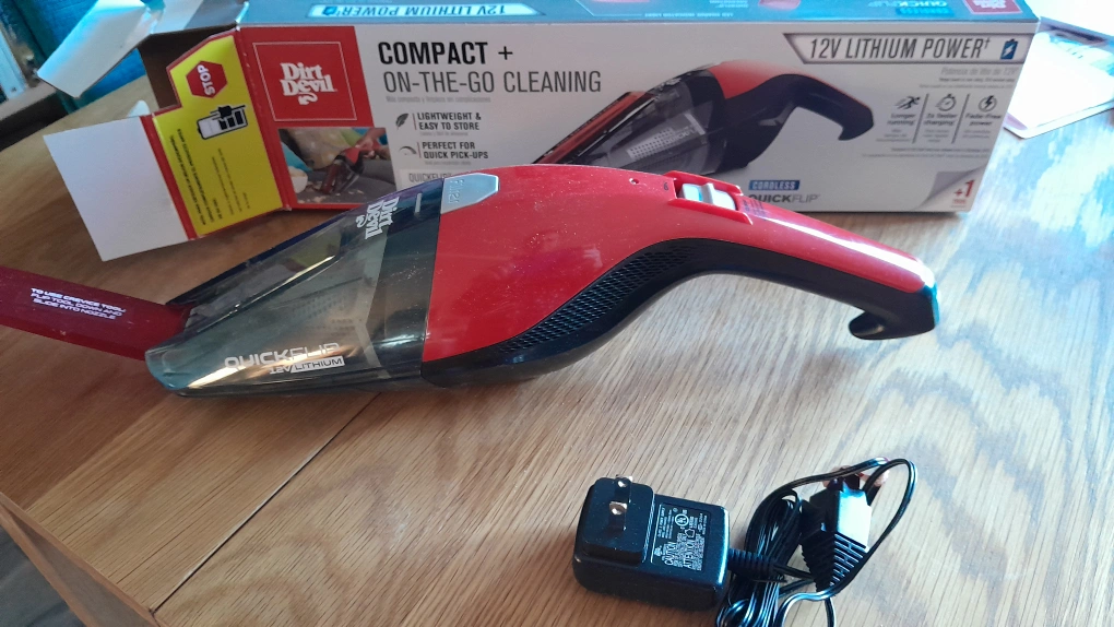 Cordless handheld vacuum with a QuickFlip crevice tool. Includes charger accessories and original packing. Hardly used.