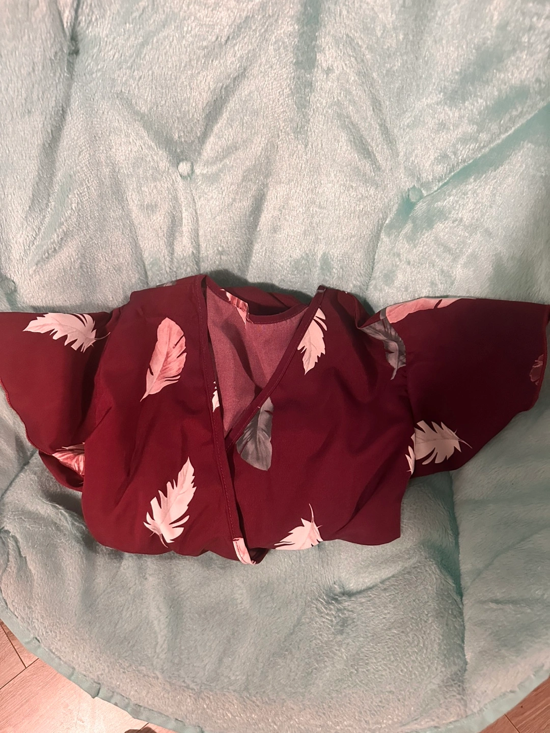 Beautiful burgundy dress. Features a v-neck, short sleeves, and an elastic waistband. Feather print throughout. Lightweight and flowy material. Perfect for summer.
