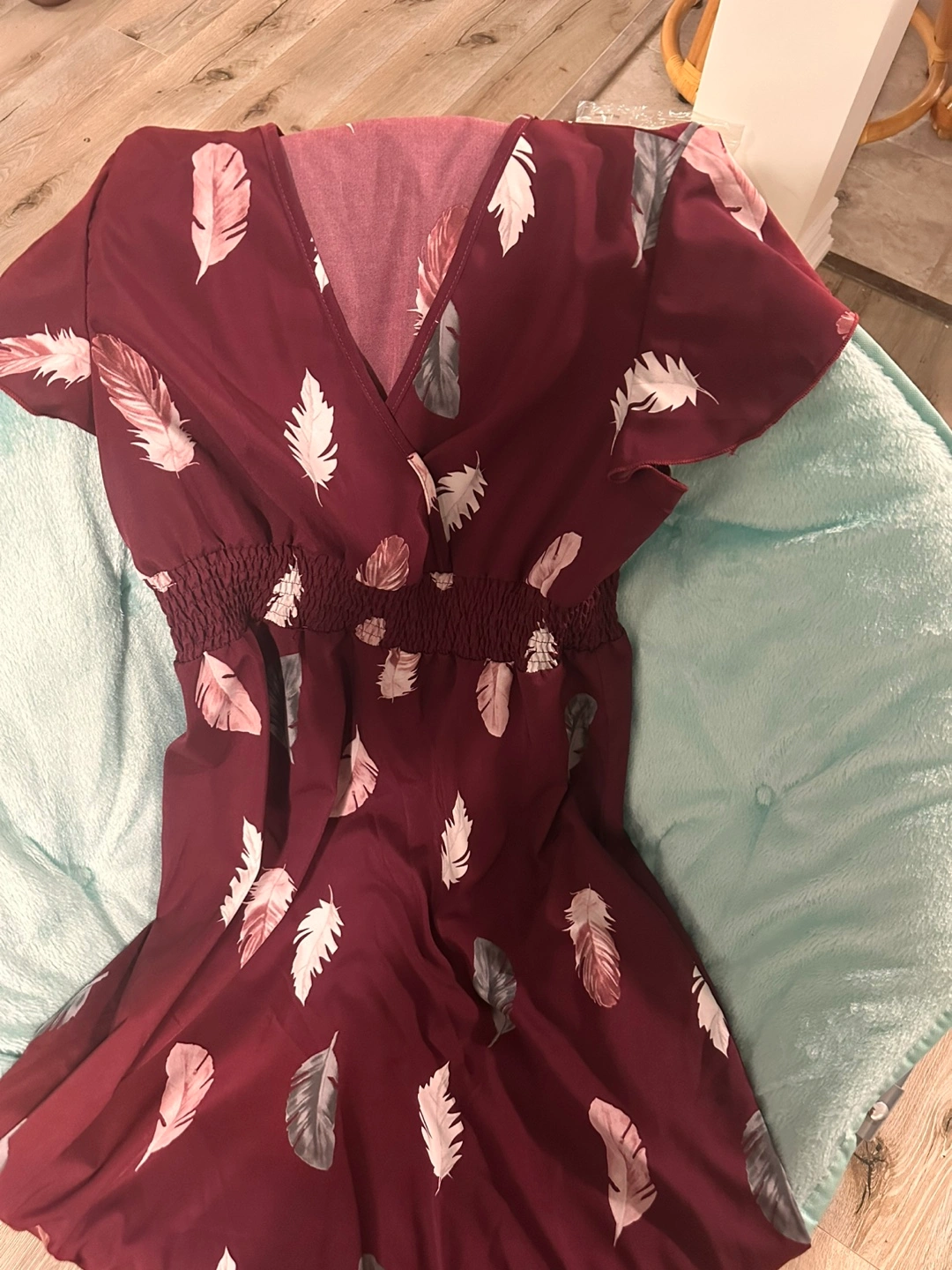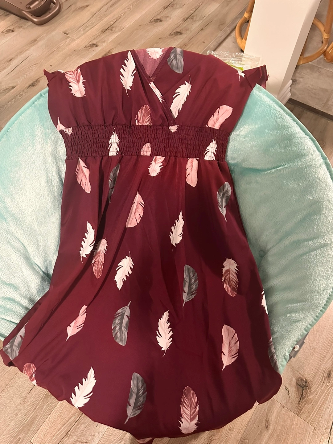 Beautiful burgundy dress. Features a v-neck, short sleeves, and an elastic waistband. Feather print throughout. Lightweight and flowy material. Perfect for summer.