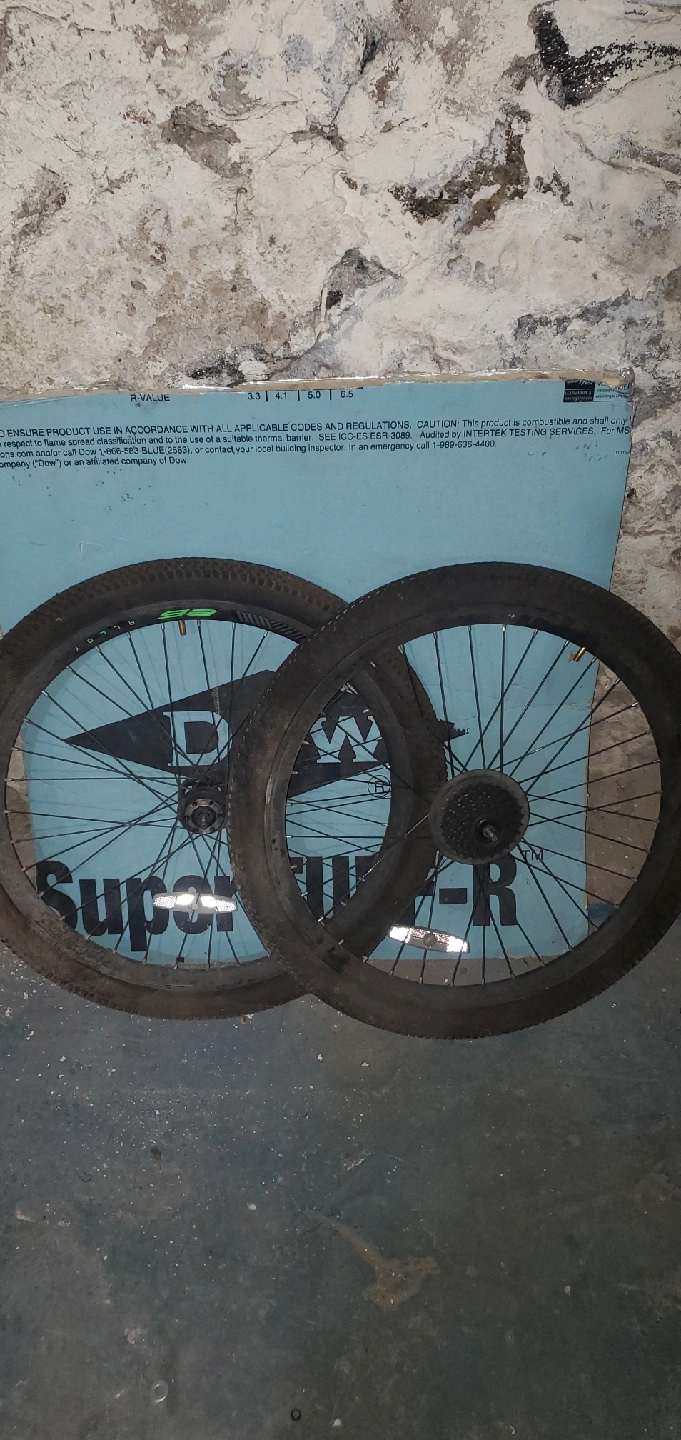 Selling a pair of used bicycle wheels. They show signs of wear, but are still functional. Great for a project or replacement, disc brake compatible