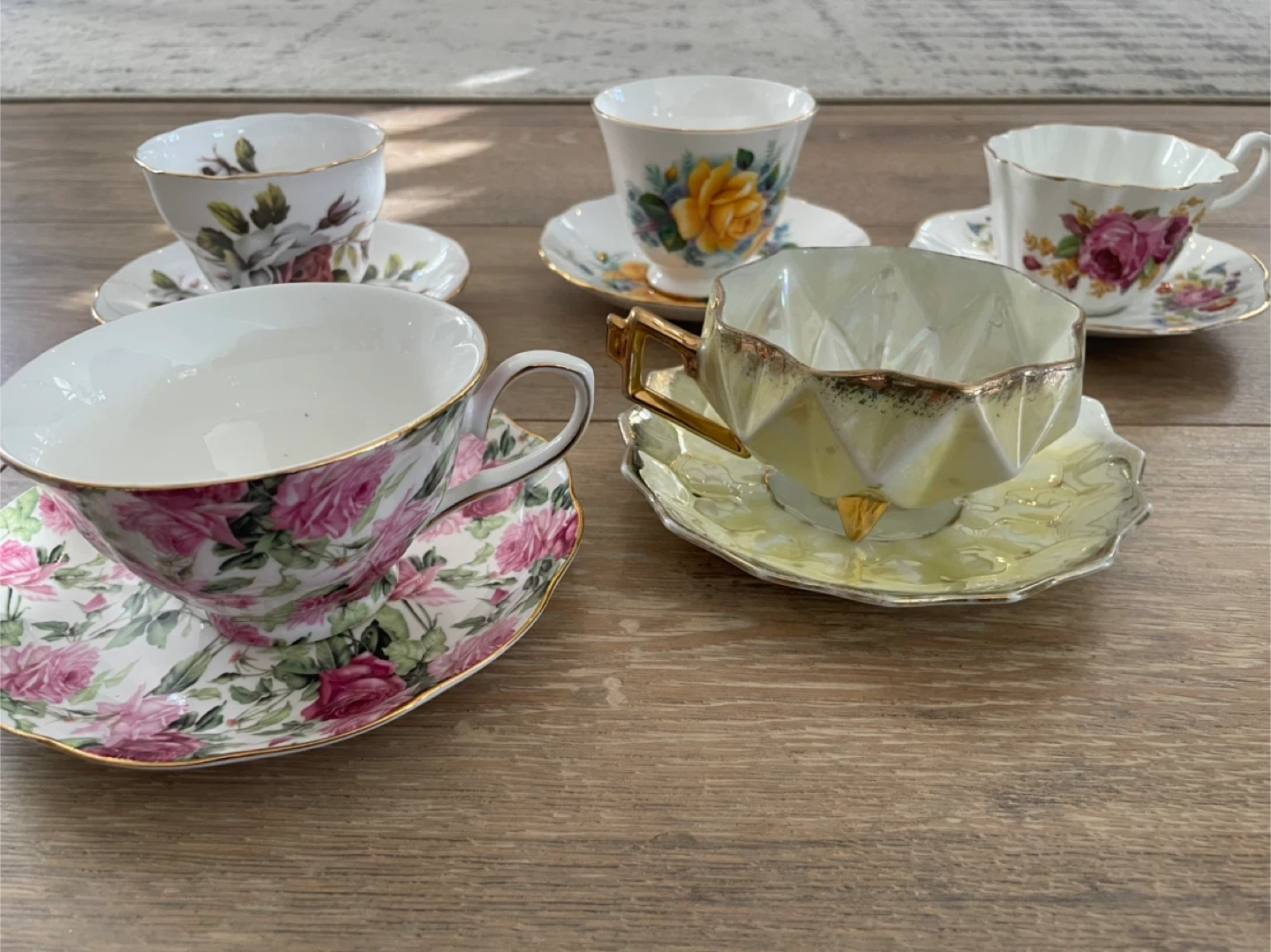 A lovely collection of five vintage teacups and saucers, each with a unique floral design and gold trim. Some cups feature delicate rose patterns, while others have single flower motifs. They're made of fine porcelain and have a classic, elegant look. This set is perfect for afternoon tea parties or for display!