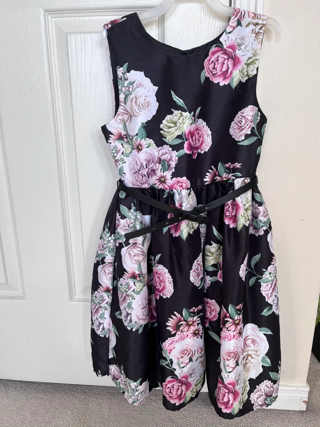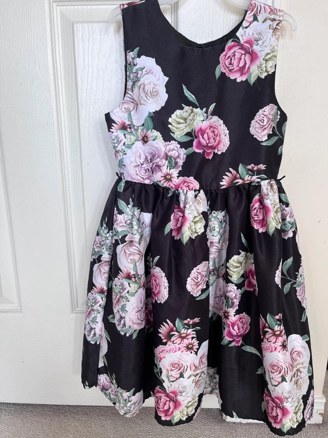 A beautiful dress for a girl 6-8 years old, with a floral print design! It features a black background with pink and white roses.