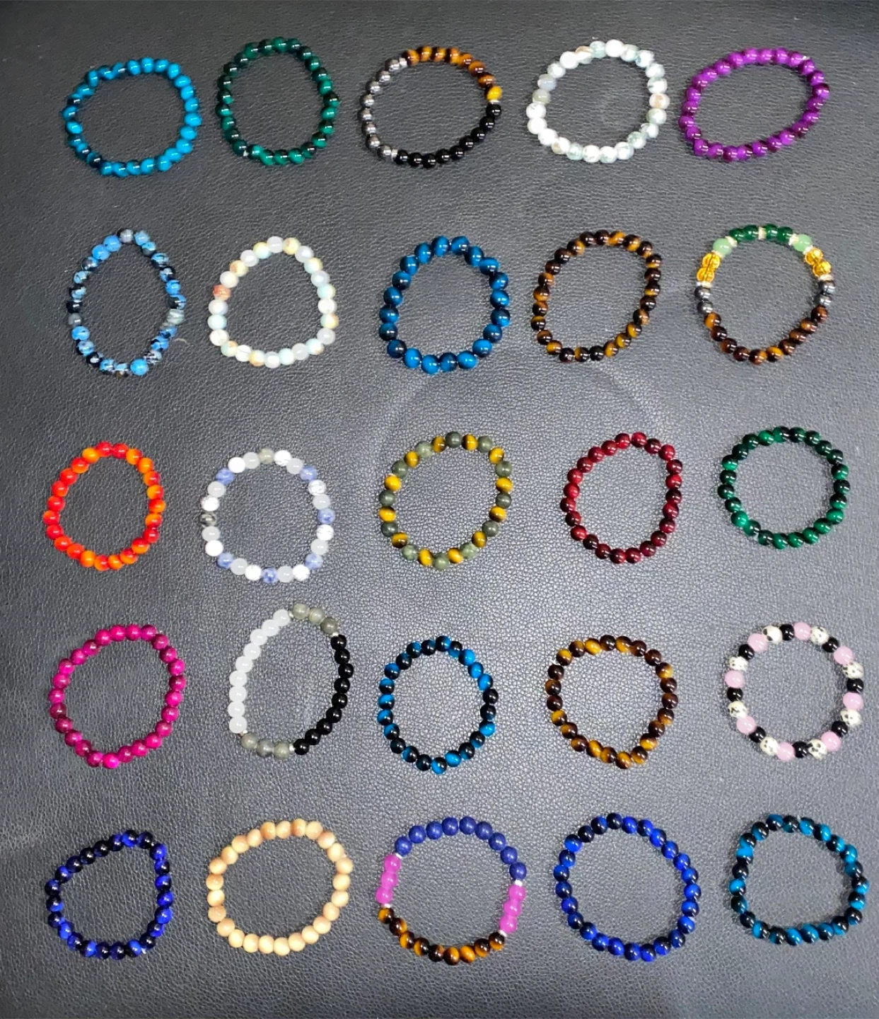 A collection of stretch beaded bracelets in various colors and stone types. Materials include what appear to be natural stones and synthetic beads. They're elastic for a comfortable fit on most wrists. These bracelets add a pop of color to any outfit!