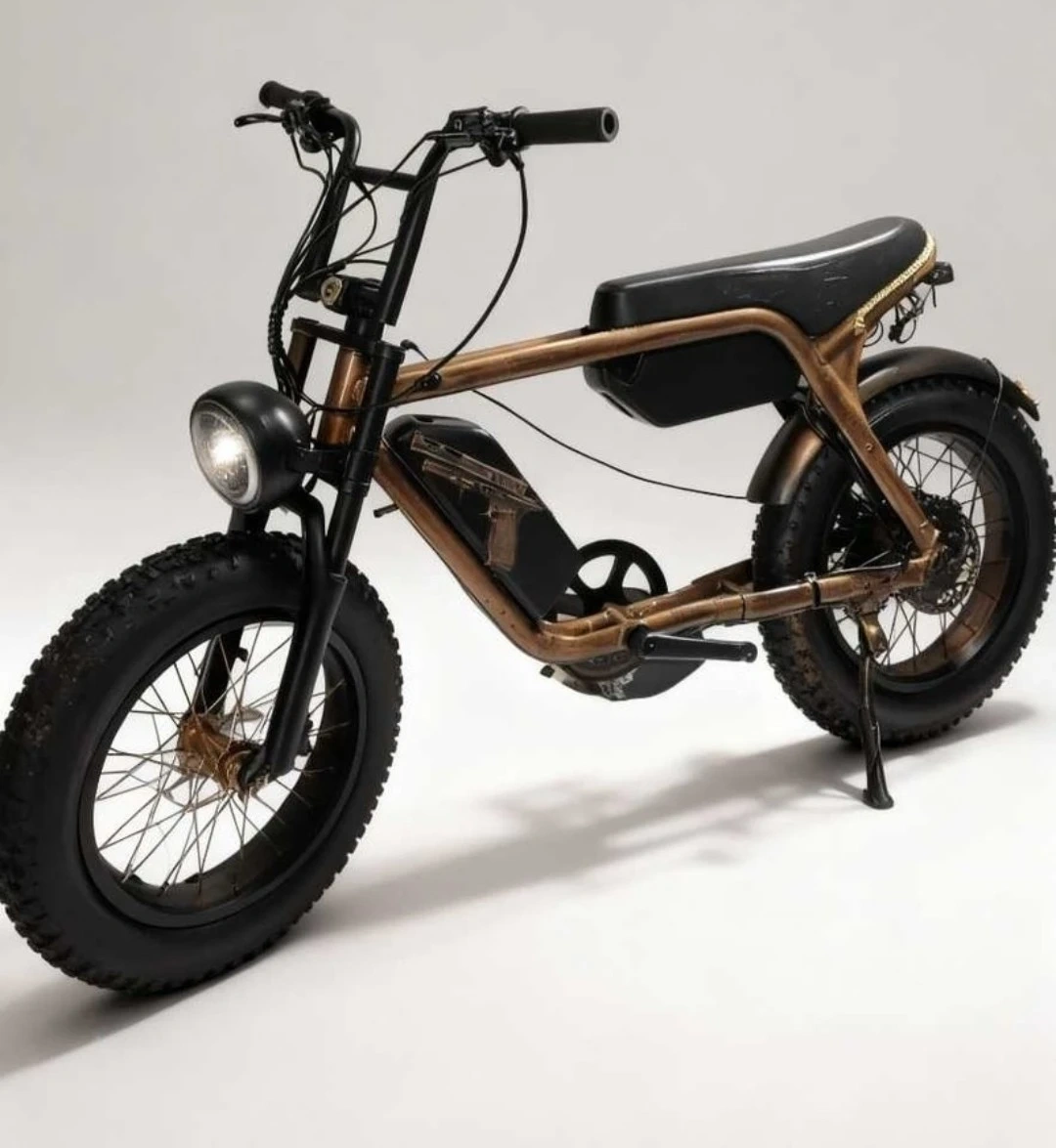 Vélo électrique avec un style unique rappelant les motos vintage. Cadre en métal couleur cuivre et noir, pneus larges et selle confortable. Parfait pour se déplacer en ville avec style!