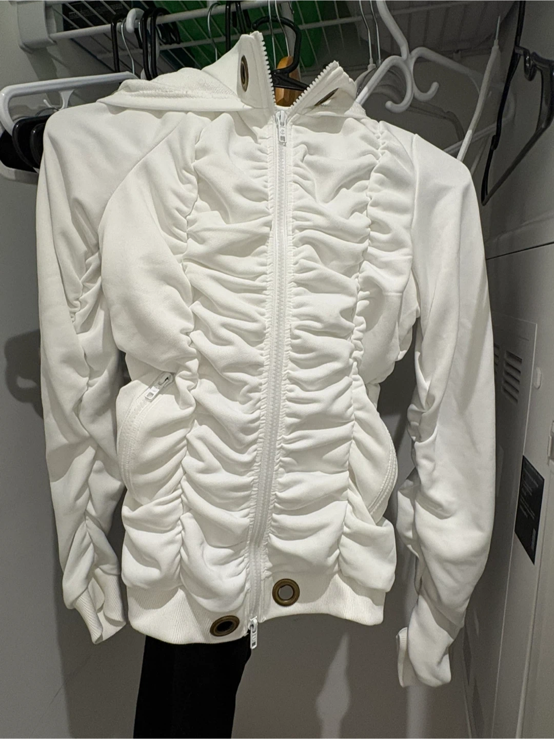 White ruched zip-up hoodie with a drawstring hood. Full zip closure and two front pockets. Made from a soft fabric blend.