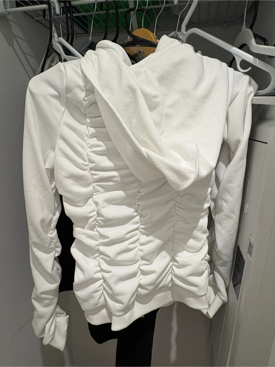 White ruched zip-up hoodie with a drawstring hood. Full zip closure and two front pockets. Made from a soft fabric blend.