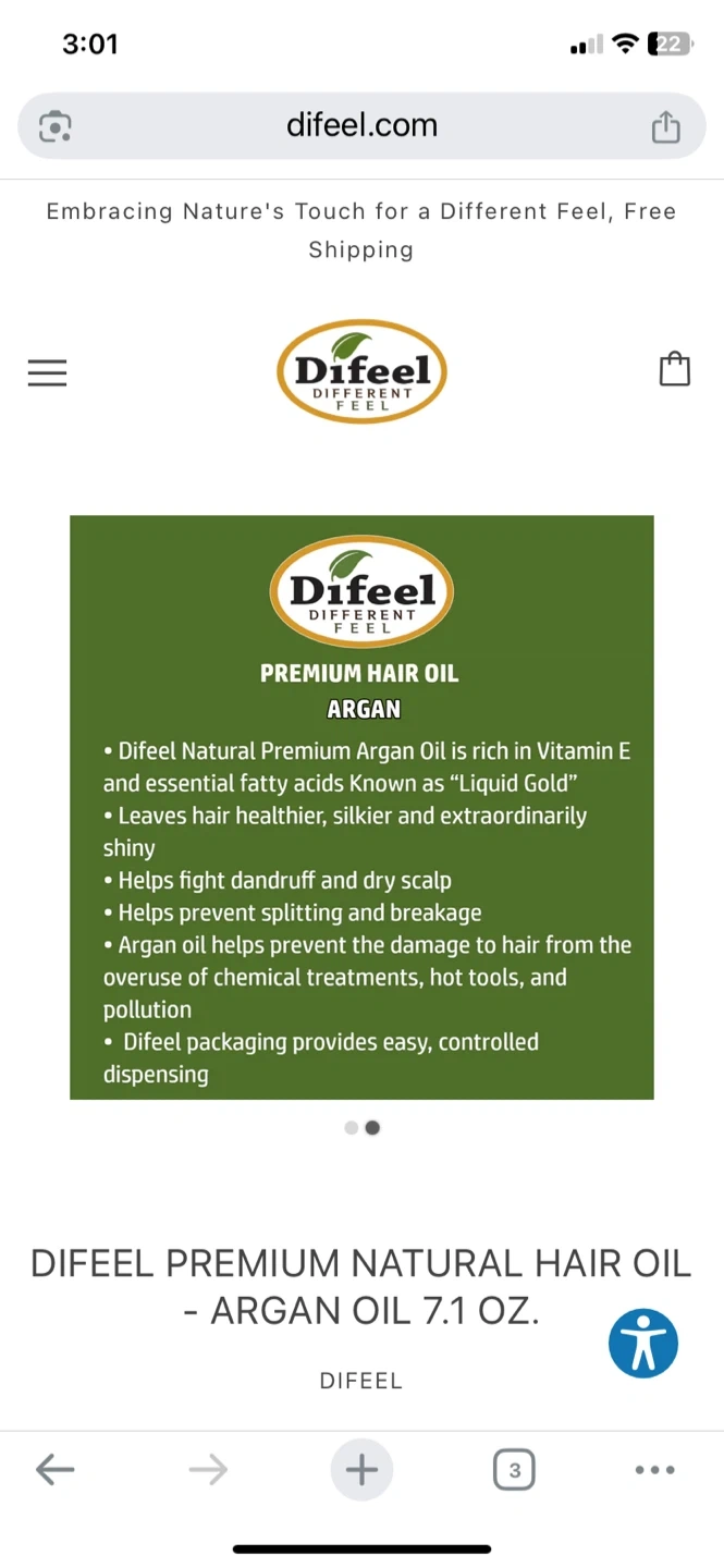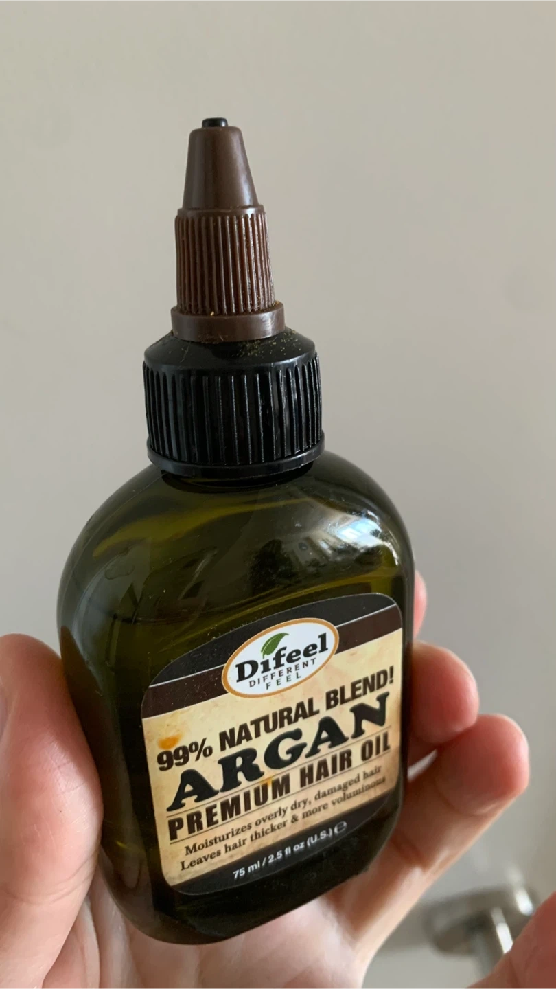 I'm selling a bottle of Difeel Argan Premium Hair Oil. It's a 99% natural blend that moisturizes overly dry and damaged hair, leaving it thicker and more voluminous. It comes in a 75ml bottle (2.5 fl oz). Argan oil is rich in Vitamin E and essential fatty acids, known as "Liquid Gold"!