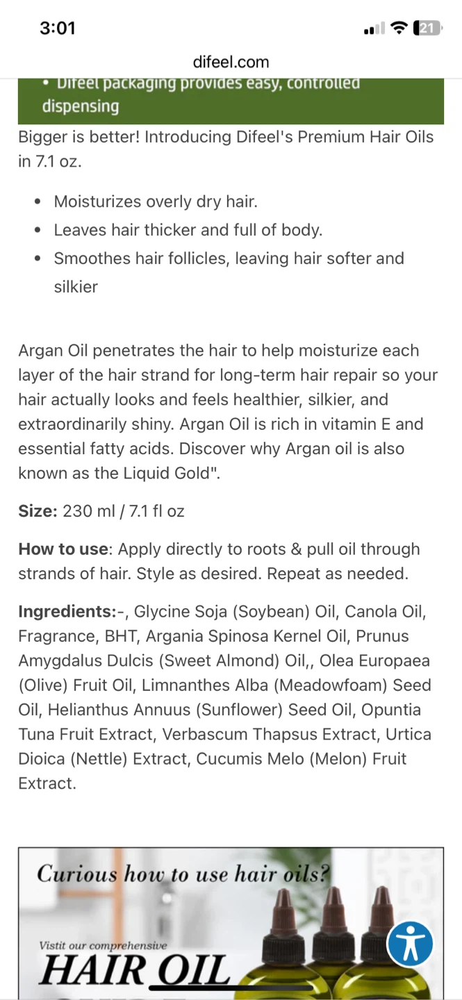 I'm selling a bottle of Difeel Argan Premium Hair Oil. It's a 99% natural blend that moisturizes overly dry and damaged hair, leaving it thicker and more voluminous. It comes in a 75ml bottle (2.5 fl oz). Argan oil is rich in Vitamin E and essential fatty acids, known as "Liquid Gold"!