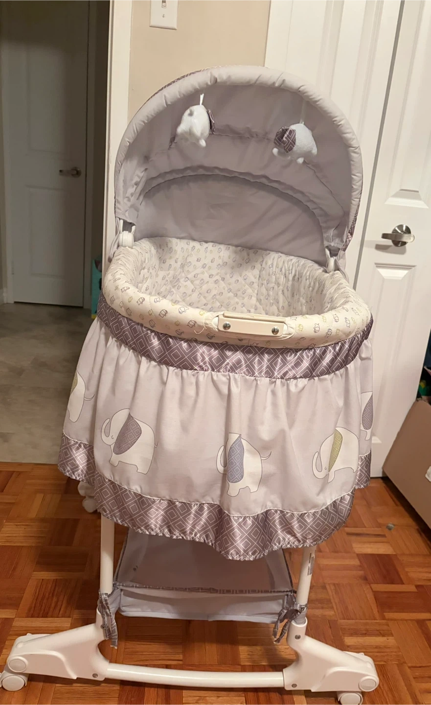Selling a gently used bassinet featuring a cute elephant design! It's in great condition and perfect for newborns. It has a storage area underneath and a hood with hanging toys to keep baby entertained OBO